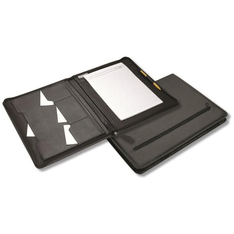 Папка деловая Алекс из искусственной кожи черного цвета (141и/чер). Папка на молнии, система карманов для документов разного формата, ручкодержатель. Комплектуется отрывным блокнотом формата А4.