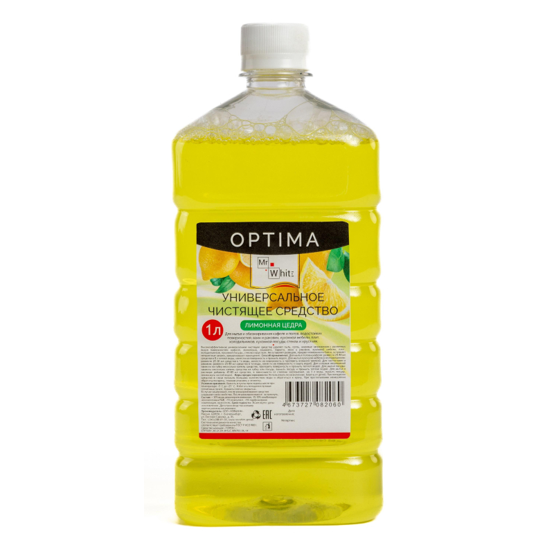 Универсальное чистящее средство Mr. White Optima Лимонная цедра жидкость 1 л. Назначение. Для мытья и обезжиривания кафеля и полов, водостойких поверхностей, ванн и раковин, кухонной мебели, плит, холодильников, кухонной посуды, стекла и хрусталя. Высокоэффективное универсальное чистящее средство удаляет пыль, грязь, жировые загрязнения с различных видов поверхностей: кафеля, линолеума, ламината, паркета, ванн и раковин, кухонной мебели, плит, холодильников, кухонной посуды, стекла и хрусталя. Не оставляет разводов, придает поверхности блеск, устраняет неприятные запахи, ароматизирует помещение. Способ применения. Для мытья полов и кафеля: развести 20-80 мл средства в 8 л теплой воды, нанести на поверхность и промыть водой. Для мытья кухонной мебели и холодильников: развести 20-30 мл средства в 1 л воды, нанести на поверхность и протереть влажной тряпкой. Для чистки ванн и раковин: развести 20-80 мл средства в 1 л воды, нанести на поверхность и смыть водой. Для сильных загрязнений нанести на губку несколько капель средства, протереть поверхность и промыть теплой водой. Для мытья посуды: нанести несколько капель средства на губку или посуду, вымыть посуду и промыть теплой водой. Для мытья в растворе добавить 40-80 мл средства, в зависимости от степени загрязнения, на 3 л воды, вымыть посуду, ополоснуть чистой водой. Меры предосторожности. Использовать по назначению. Беречь от детей. При попадании средства в глаза промыть большим количеством воды и обратиться к врачу. При проглатывании немедленно обратиться к врачу, показав упаковку и этикетку. Состав. >30% вода деминерализованная, 15-30% комбинация неионогенных ПАВ,