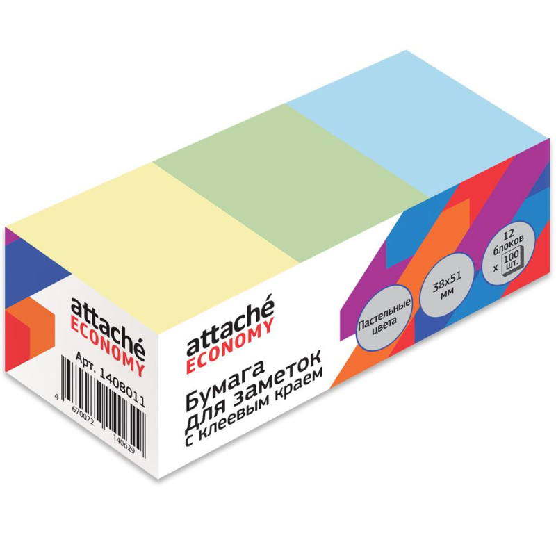 Стикеры Attache Economy подходят для использования в офисе, дома, во время обучения. Формат: 38x51 мм. Клеевая система - 18 Н/м. Длина клейкой стороны 38 мм. 12 блоков по 100 листов, упакованых в коробку и термопленку. 3 пастельных цвета. Особых условий хранения не требует, сертификации не подлежит, срок годности не ограничен.Товар относится к ценовому сегменту "суперэконом". Имеет упрощенные характеристики и более простую упаковку. Отвечает основным требованиям потребления.