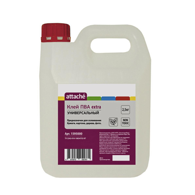Морозостойкий Клей Attache extra 2,5 кг идеален для использования в канцелярских целях - незаменим в делопроизводстве. Может использоваться в быту для работ с картоном и фотобумагой. Перед применением клей необходимо перемешать и, очистив склеиваемые поверхности от загрязнений и просушив их, нанести клей, соединить и прижать. Склеиваемое соединение надо оставить в сжатом состоянии не менее чем на 2 часа. Время полного высыхания при температуре 20°С и относительной влажности воздуха 65% - 24 часа. Клей морозостойкий и не теряет своих свойств после 4 циклов замораживания-размораживания при температуре -40°. Состав не токсичен и безопасен при применении по назначению. Габариты: 230х170х100 мм