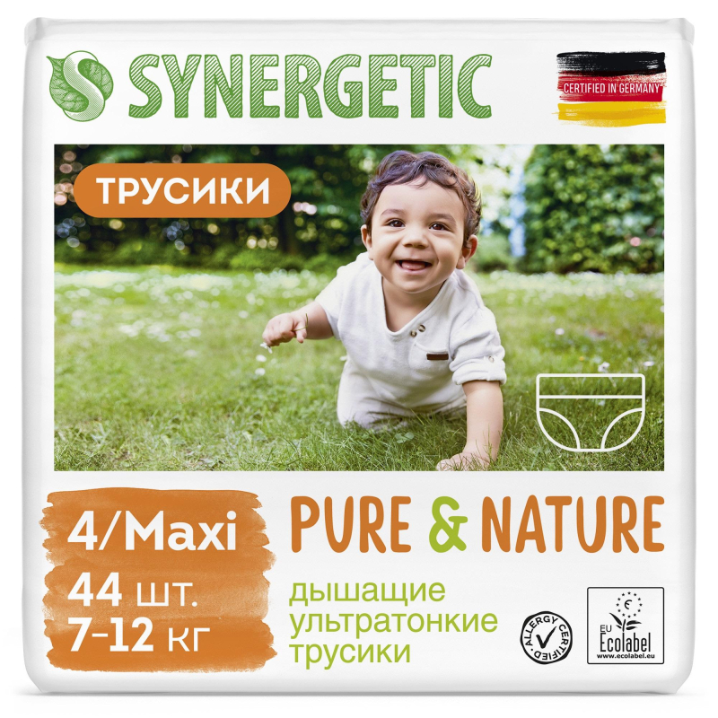 Детские подгузники-трусики Synergetic Pure&Nature 4 / maxi (7-12 кг) дышащие, ультратонкие, 44 штуки. Дышащие ультратонкие подгузники-трусики Synergetic Pure&Nature произведены в Бельгии с использованием натуральных материалов и 100% возобновляемых источников энергии. Воздушные волокна целлюлозы и премиальный органический хлопок в составе обеспечивают максимальное удобство и комфорт трусиков во время сна и активных игр. Мягкий внутренний слой создан из натуральных материалов на основе кукурузы и сахарного тростника. Не содержат в составе хлора, латекса, отдушек и лосьонов. Высокий ультрамягкий эластичный поясок обеспечивает идеальную посадку трусиков с защитой от протеканий до 12 часов. Обладают высокой воздухопроницаемостью, защищая кожу от опрелостей. Запатентованная система SeconDRY обеспечивает мгновенное поглощение и распределение жидкости. Кожа малыша остается гарантированно сухой даже во время ночного сна. Трусики Synergetic получили международные сертификаты качества и эко-маркировки: EU Ecolabel, Dermatest, Standard 100 by OEKO-TEX, AllergyCertified, Cotton Enhanced TM. Способ применения: Откройте упаковку, достаньте подгузники-трусики, расправьте их. Просуньте ладони в проймы для ножек, затем вставьте в них ножки малыша. Если малыш стоит во время смены трусиков, то лучше, чтобы он держался за вас. Просовывая ножки поочередно, подтяните трусики до уровня пупка. Расправьте поясок и оборки на проймах, убедитесь, что они плотно прилегают к телу и не загнулись вовнутрь. Снимайте подгузники-трусики как обычные трусики. Для быстрого снятия наполненных трусиков просто разорвите боковые швы на резинке. Использованные трусики необходимо свернуть, зафиксировать с помощью клейкого ярлычка и утилизировать. Рекомендуется менять подгузники-трусики каждые 4 часа и после каждого стула малыша. Индикатор наполнения подскажет, когда необходимо поменять подгузники-трусики. Состав: Распушенная целлюлоза (отбеленная без хлора), САП (супер абсорбент), нетканый материал, полиэтилен, клей, нить эластомерная. Условия хранения: Хранить в сухом, защищенном от влаги месте, вдали от прямых солнечных лучей, открытого огня и отопительных приборов, отдельно от пищевых продуктов, в местах, недоступных для детей и животных. Срок годности: 3 года с даты производства, указанной на ##паковке. Не использовать после окончания срока годности!