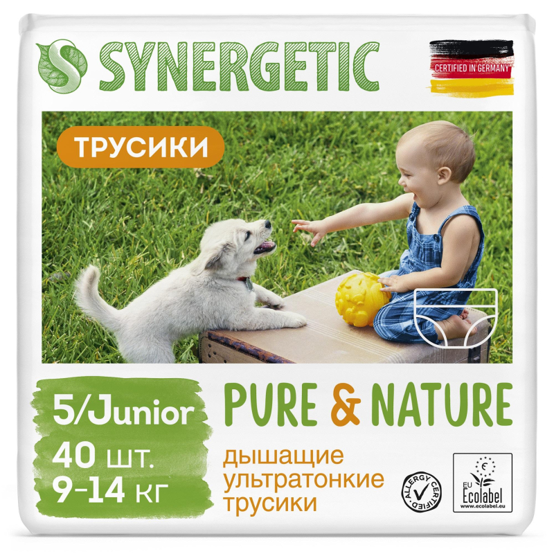 Детские подгузники-трусики Synergetic Pure&Nature 5 / junior (9-14 кг) дышащие, ультратонкие, 40 штук. Дышащие ультратонкие подгузники-трусики Synergetic Pure&Nature произведены в Бельгии с использованием натуральных материалов и 100% возобновляемых источников энергии. Воздушные волокна целлюлозы и премиальный органический хлопок в составе обеспечивают максимальное удобство и комфорт трусиков во время сна и активных игр. Мягкий внутренний слой создан из натуральных материалов на основе кукурузы и сахарного тростника. Не содержат в составе хлора, латекса, отдушек и лосьонов. Высокий ультрамягкий эластичный поясок обеспечивает идеальную посадку трусиков с защитой от протеканий до 12 часов. Обладают высокой воздухопроницаемостью, защищая кожу от опрелостей. Запатентованная система SeconDRY обеспечивает мгновенное поглощение и распределение жидкости. Кожа малыша остается гарантированно сухой даже во время ночного сна. Трусики Synergetic получили международные сертификаты качества и эко-маркировки: EU Ecolabel, Dermatest, Standard 100 by OEKO-TEX, AllergyCertified, Cotton Enhanced TM. Способ применения: Откройте упаковку, достаньте подгузники-трусики, расправьте их. Просуньте ладони в проймы для ножек, затем вставьте в них ножки малыша. Если малыш стоит во время смены трусиков, то лучше, чтобы он держался за вас. Просовывая ножки поочередно, подтяните трусики до уровня пупка. Расправьте поясок и оборки на проймах, убедитесь, что они плотно прилегают к телу и не загнулись вовнутрь. Снимайте подгузники-трусики как обычные трусики. Для быстрого снятия наполненных трусиков просто разорвите боковые швы на резинке. Использованные трусики необходимо свернуть, зафиксировать с помощью клейкого ярлычка и утилизировать. Рекомендуется менять подгузники-трусики каждые 4 часа и после каждого стула малыша. Индикатор наполнения подскажет, когда необходимо поменять подгузники-трусики. Состав: Распушенная целлюлоза (отбеленная без хлора), САП (супер абсорбент), нетканый материал, полиэтилен, клей, нить эластомерная. Условия хранения: Хранить в сухом, защищенном от влаги месте, вдали от прямых солнечных лучей, открытого огня и отопительных приборов, отдельно от пищевых продуктов, в местах, недоступных для детей и животных. Срок годности: 3 года с даты производства, указанной на ##паковке. Не использовать после окончания срока годности!