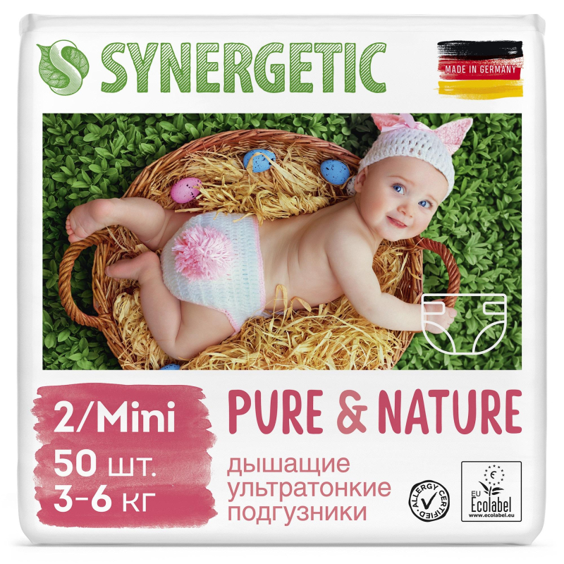 Детские подгузники Synergetic Pure&Nature 2/mini (3-6 кг) дышащие, ультратонкие, 50 штук. Дышащие ультратонкие подгузники Synergetic Pure&Nature произведены с использованием натуральных материалов и 100% возобновляемых источников энергии. Воздушные волокна целлюлозы и премиальный органический хлопок в составе обеспечивают максимальное удобство и комфорт подгузника во время сна и активных игр. Мягкий внутренний слой подгузников создан из натуральных материалов на основе кукурузы и сахарного тростника. Подгузники не содержат в составе хлора, латекса, отдушек и лосьонов. Подгузники Synergetic обеспечивают надежную защиту до 12 часов. Обладают высокой воздухопроницаемостью, защищая кожу от опрелостей. Запатентованная система SeconDRY обеспечивает мгновенное поглощение и распределение жидкости. Кожа малыша остается сухой даже во время ночного сна. Способ применения: откройте упаковку и достаньте подгузник, поднимите вертикально бортики, разверните боковинки и расправьте застежки-липучки. Положите ребенка на развернутый подгузник так, чтобы поясок оказался под поясницей ребенка. Переднюю часть подгузника зафиксируйте на животике малыша и симметрично закрепите застежки-липучки на ленте на передней части подгузника, затем расправьте складки и оборки возле ножек малыша. Застежки-липучки можно многократно отстегивать и застегивать. Рекомендуется менять подгузник каждые 4 часа и после каждого стула малыша. Индикатор наполнения подскажет, когда необходимо поменять подгузник. Состав: распушенная целлюлоза (отбеленная без хлора), САП (супер абсорбент), нетканый материал, полиэтилен, клей. Условия хранения: хранить в сухом, защищенном от влаги месте, вдали от прямых солнечных лучей, открытого огня и отопительных приборов, отдельно от пищевых продуктов, в местах, недоступных для детей и животных. Срок годности: 3 года с даты производства, указанной на упаковке. Не использовать после окончания срока годности!