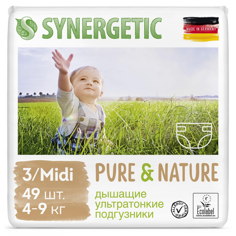 Детские подгузники Synergetic Pure&Nature 3/midi (4-9 кг) дышащие, ультратонкие, 49 штук. Дышащие ультратонкие подгузники Synergetic Pure&Nature произведены в Германии с использованием натуральных материалов и 100% возобновляемых источников энергии. Воздушные волокна целлюлозы и премиальный органический хлопок в составе обеспечивают максимальное удобство и комфорт подгузника во время сна и активных игр. Мягкий внутренний слой подгузников создан из натуральных материалов на основе кукурузы и сахарного тростника. Подгузники не содержат в составе хлора, латекса, отдушек и лосьонов. Подгузники Synergetic обеспечивают надежную защиту до 12 часов. Обладают высокой воздухопроницаемостью, защищая кожу от опрелостей. Запатентованная система SeconDRY обеспечивает мгновенное поглощение и распределение жидкости. Кожа малыша остается сухой даже во время ночного сна. Способ применения: откройте упаковку и достаньте подгузник, поднимите вертикально бортики, разверните боковинки и расправьте застежки-липучки. Положите ребенка на развернутый подгузник так, чтобы поясок оказался под поясницей ребенка. Переднюю часть подгузника зафиксируйте на животике малыша и симметрично закрепите застежки-липучки на ленте на передней части подгузника, затем расправьте складки и оборки возле ножек малыша. Застежки-липучки можно многократно отстегивать и застегивать. Рекомендуется менять подгузник каждые 4 часа и после каждого стула малыша. Индикатор наполнения подскажет, когда необходимо поменять подгузник. Состав: распушенная целлюлоза (отбеленная без хлора), САП (супер абсорбент), нетканый материал, полиэтилен, клей. Условия хранения: хранить в сухом, защищенном от влаги месте, вдали от прямых солнечных лучей, открытого огня и отопительных приборов, отдельно от пищевых продуктов, в местах, недоступных для детей и животных. Срок годности: 3 года с даты производства, указанной на упаковке. Не использовать после окончания срока годности!