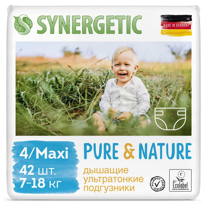 Детские подгузники Synergetic Pure&Nature 4/maxi (7-18 кг) дышащие, ультратонкие, 42 штуки. Дышащие ультратонкие подгузники Synergetic Pure&Nature произведены в Германии с использованием натуральных материалов и 100% возобновляемых источников энергии. Воздушные волокна целлюлозы и премиальный органический хлопок в составе обеспечивают максимальное удобство и комфорт подгузника во время сна и активных игр. Мягкий внутренний слой подгузников создан из натуральных материалов на основе кукурузы и сахарного тростника. Подгузники не содержат в составе хлора, латекса, отдушек и лосьонов. Подгузники Synergetic обеспечивают надежную защиту до 12 часов. Обладают высокой воздухопроницаемостью, защищая кожу от опрелостей. Запатентованная система SeconDRY обеспечивает мгновенное поглощение и распределение жидкости. Кожа малыша остается сухой даже во время ночного сна. Способ применения: откройте упаковку и достаньте подгузник, поднимите вертикально бортики, разверните боковинки и расправьте застежки-липучки. Положите ребенка на развернутый подгузник так, чтобы поясок оказался под поясницей ребенка. Переднюю часть подгузника зафиксируйте на животике малыша и симметрично закрепите застежки-липучки на ленте на передней части подгузника, затем расправьте складки и оборки возле ножек малыша. Застежки-липучки можно многократно отстегивать и застегивать. Рекомендуется менять подгузник каждые 4 часа и после каждого стула малыша. Индикатор наполнения подскажет, когда необходимо поменять подгузник. Состав: распушенная целлюлоза (отбеленная без хлора), САП (супер абсорбент), нетканый материал, полиэтилен, клей. Условия хранения: хранить в сухом, защищенном от влаги месте, вдали от прямых солнечных лучей, открытого огня и отопительных приборов, отдельно от пищевых продуктов, в местах, недоступных для детей и животных. Срок годности: 3 года с даты производства, указанной на упаковке. Не использовать после окончания срока годности!