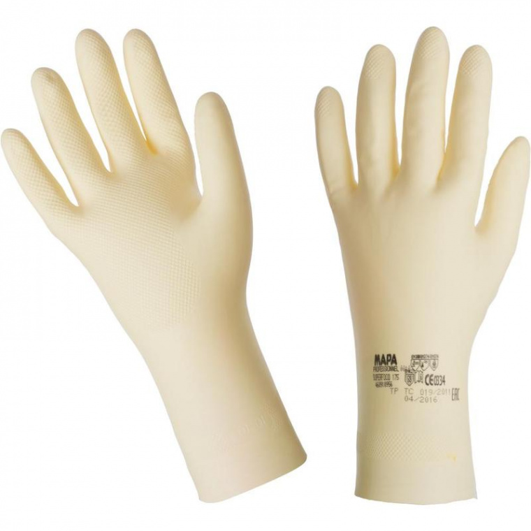 Перчатки Mapa Vital/Superfood из латекса, внутренняя поверхность обработана хлором, с текстурированной рабочей поверхностью. Обеспечивают защиту рук от растворов кислот и щелочей (концентрация до 20%), масел, жиров и моющих средств. Размер 10 или XL. Толщина 0,4 мм. Длина 31 см. Тип манжеты: удлиненный. Поверхность области захвата: рельефная. Цвет: белый. Перчатки Mapa Superfood рекомендуются для пищевого производства и работы с продуктами питания, а также клининга и машиностроения (сборка небольших деталей, не покрытых маслом и смазкой). Количество в упаковке: 1 пара. Количество упаковок в транспортном коробе: 100. Соответствуют ТР ТС 019/2011. Товар поставляется в нескольких вариантах цвета (без возможности выбора).
