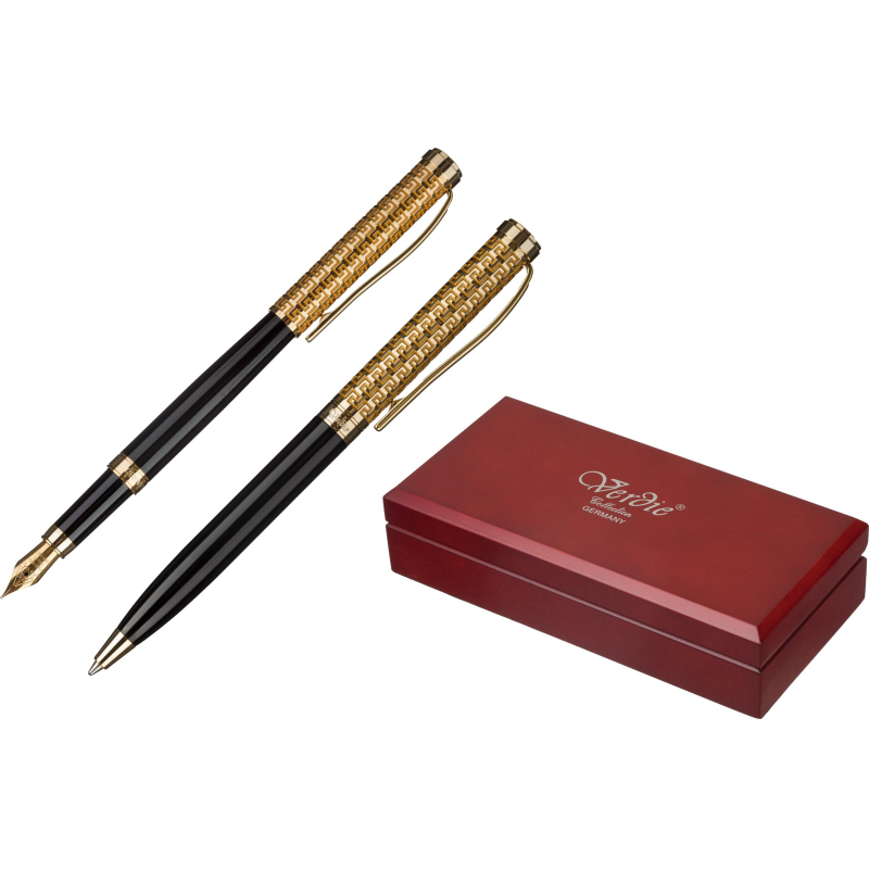 Набор из двух ручек перьевой и шариковой в стиле Givenchy. Золотистый колпачок перьевой ручки и верх шариковой имеют фигурную гравировку, а тело ручек покрыто многослойным черным лаком и подходит для гравировки. Эстетика набора делает его отличным презентом для делового партнера или ценителя красоты. Подходит как для мужчин, так и для женщин. Шариковая ручка комплектуется стержнем типа Parker, а перьевая сменным картриджем. Набор поставляется в премиальном деревянном футляре. Толщина линии письма: 0.7 мм.