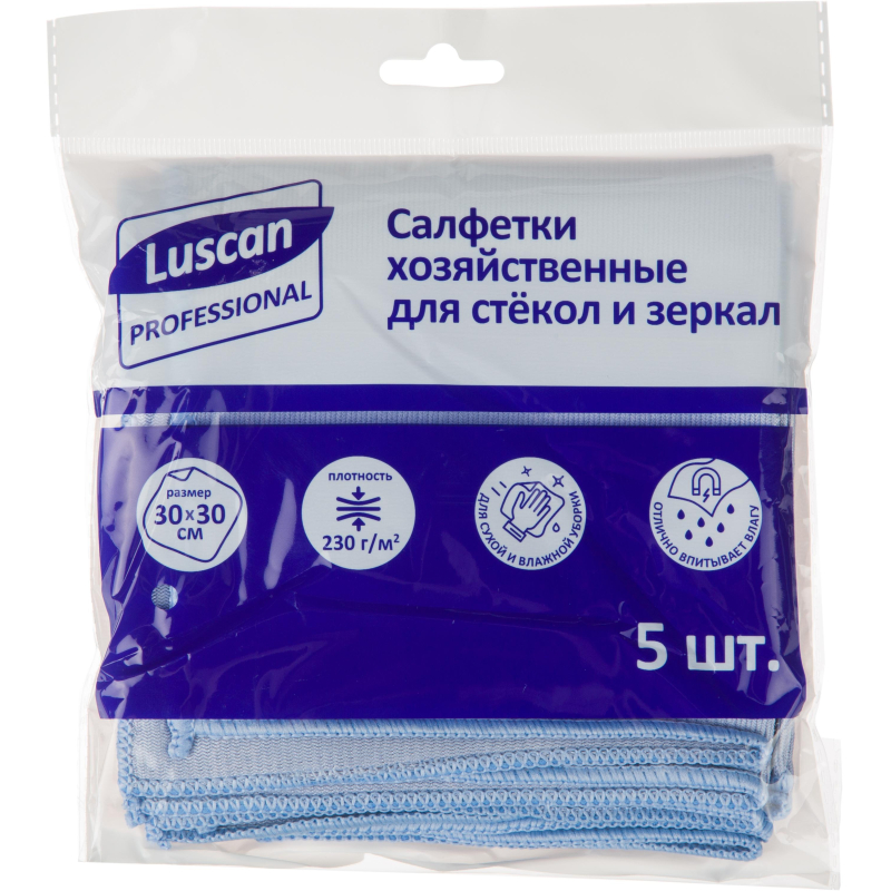 Салфетки хозяйственные Luscan Professional микрофибра 30х30 см 230 г/кв.м синие 5 штук в упаковке Назначение: салфетки хозяйственные Luscan Professional из микрофибры предназначены для сухой и влажной уборки. Особенности и преимущества: Салфетки из микрофибры - незаменимый помощник для дома и офиса. Салфетки отлично убирают пыль и грязь со стекол, зеркал, глянцевых и хромированных поверхностей. Салфетки полирует и придает сияние поверхностям, не оставляя разводов и ворсинок. Характеристики: - размер: 30x30 см. - цвет: синий - плотность: 230 г/кв.м - состав: 80% полиэстер, 20% полиамид - 5 штук в упаковке Рекомендации по уходу: машинная стирка при температуре 60°С. При стирке не используйте кондиционер для белья или моющие средства с хлором, чтобы сохранить структуру ткани. Стирать салфетки нужно отдельно от других изделий.