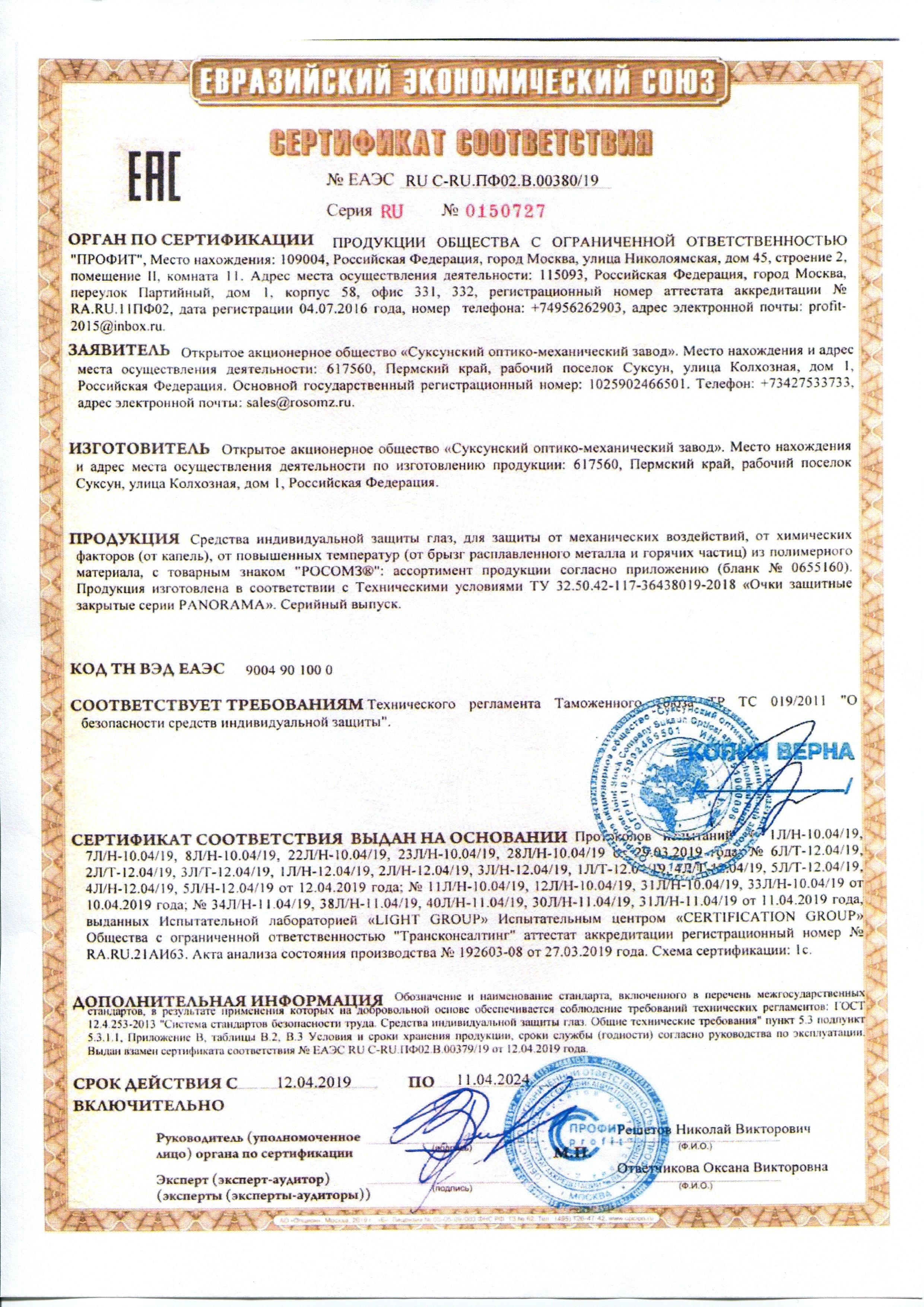 Сертификат на товар - Очки защитные закрытые газосварочные РОСОМЗ ЗП2 Super Panorama затемненные (30228)