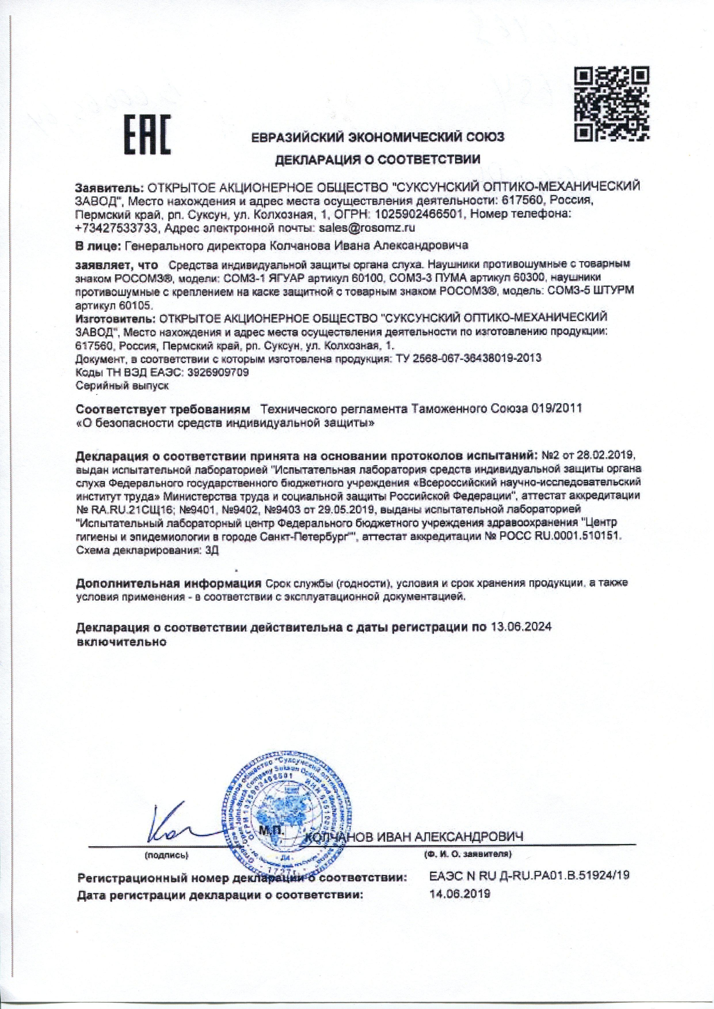 Противошумные наушники РОСОМЗ СОМЗ-1 «Ягуар» предназначены для защиты слуха от шума, уровень которого не превышает 27 дБ. Наушники имеют стандартное крепление. Конструкция состоит из регулируемого пружинящего оголовья, мягкого амортизирующего крепления, двух пластмассовых чашек со съемными звукопоглощателями. Модель можно отрегулировать под любую форму головы для наилучшего прилегания и носить длительное время без утомления. Наушники защищают от шума на производстве, сохраняя восприятие речи и сигналов опасности. Наушники обладают избирательным поглощением уровня шума, защищают от производственного шума, но дают возможность различать речь и сигналы опасности. Высокоэффективная, легкая, удобная модель СОМЗ-1 обеспечивает удобство эксплуатации за счет сбалансированного по усилию прижатия оголовья, мягких амортизирующих креплений между оголовьем и чашками, пластмассовых чашек, мягких амортизаторов и звукопоглощающих вкладышей. Звукопоглощающие вкладыши легко достаются и промываются мыльно-щелочным раствором. Чашки наушников выполнены из прочного ABS-пластика, устойчивого к воздействию УФ-лучей. Применение: для защиты органов слуха в течение всего рабочего дня во всех отраслях народно-хозяйственного комплекса России и стран СНГ, включая машиностроение и металлургию при механических работах, например, клепка, ковка, штамповка, а также от постоянного действия внутрицеховых шумов от работы станков и механизмов. Данное изделие соответствует требованиям безопасности Технического регламента Таможенного союза ТР ТС 019/2011. Цвет: желтый. Вес — 139 г. Срок хранения: 36 месяцев. Срок эксплуатации: 6 месяцев.