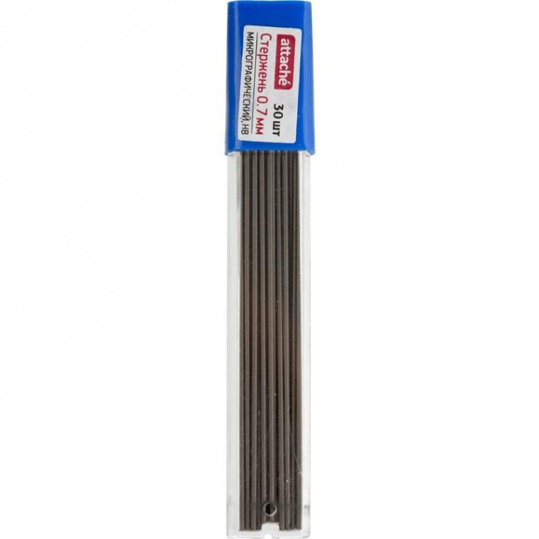 Сменный стержень микрографический Attache используется в механических карандашах. В пластиковом футляре 30 грифелей толщиной 0,7 мм. Изготовлены из полимерных материалов, обеспечивающих мягкое письмо. Твердость каждого — НВ.