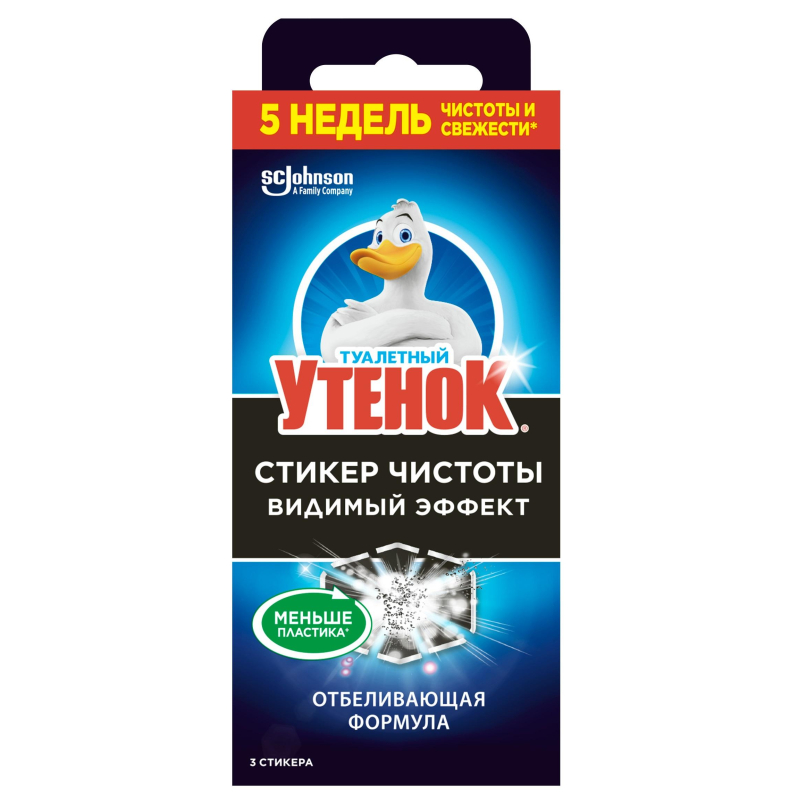 Стикер для унитаза Туалетный утенок Океанский оазис (3 штуки в упаковке) Чистит и освежает. Удобно и гигиенично. Содержит отбеливающий компонент (активный хлор), который эффективно очищает и отбеливает поверхность унитаза, а также обладает антимикробным действием. Благодаря очистителю Туалетный утенок "Стикер чистоты" на поверхности унитаза образуется защитный слой, который препятствует образованию минеральных отложений, являющихся очагами скопления микробов. Очиститель крепится внутри унитаза ниже ободка на сухую поверхность. Обладает приятным ароматом, полностью растворяется в воде. Упаковки стикеров хватает более, чем на 550 смываний. Способ применения. Надорвите пакетик, извлеките стикер и отогните бумажную защиту с одной из ее сторон. Держа за отогнутую бумажку, СИЛЬНО ПРИЖМИТЕ стикер к внутренней сухой поверхности унитаза и разгладьте по краям. Снимите оставшуюся бумагу. Старайтесь закреплять стикеры так, чтобы их сложно было заметить. Стикер полностью растворяется. После израсходования замените на новый. Сохраняйте внешнюю упаковку с рекомендациями по применению до окончания использования. Меры предосторожности. При попадании в глаза вызывает выраженное раздражение. При попадании на кожу вызывает слабое раздражение. Вредно для водных организмов с долгосрочными последствиями. Использовать только по назначению согласно инструкции. Беречь от детей и домашних животных. При необходимости обратиться за медицинской помощью, по возможности показать упаковку/маркировку продукта. После обращения со средством тщательно вымыть руки. Использовать перчатки, средства защиты глаз. ПРИ ПОПАДАНИИ В ГЛАЗА: осторожно промыть глаза водой в течение нескольких минут. Снять контактные линзы, если Вы ими пользуетесь и, если это легко сделать. Продолжить промывание глаз. Если раздражение глаз не проходит, обратиться за медицинской помощью. ПРИ ПРОГЛАТЫВАНИИ: при плохом самочувствии обратиться за медицинской помощью. Избегать попадание в окружающую среду. Состав. а-ПАВ ? 30%, сульфат натрия, отдушка (Бутилфенилметилпропиональ, кумарин, цитраль), н-ПАВ