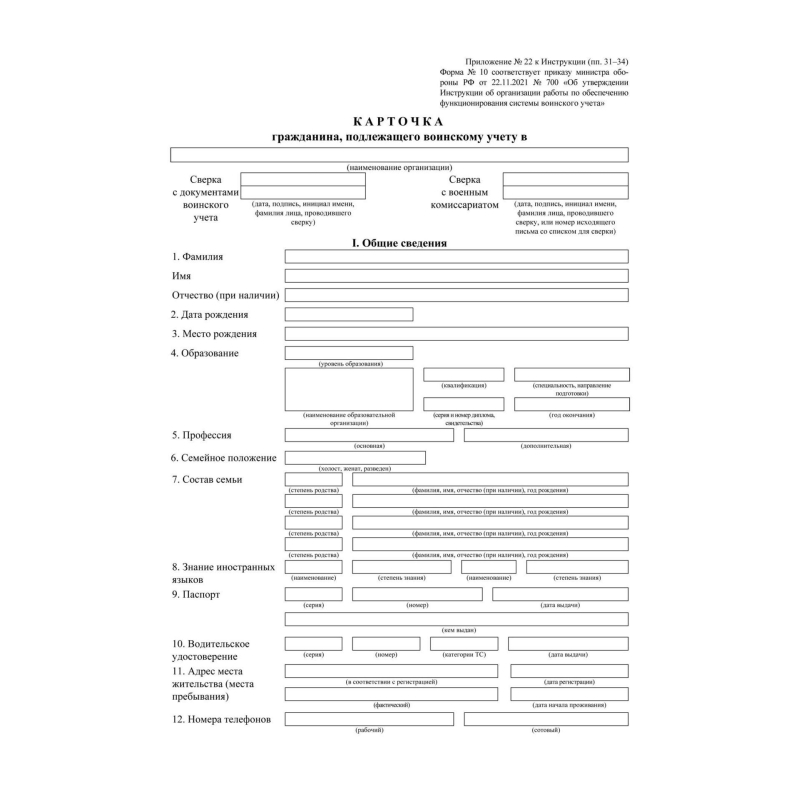 Карточка соответствует Приложению № 22 к Инструкции (пп. 31-34). Форма № 10 соответствует приказу Министра обороны РФ от 22.11.2021 № 700 'Об утверждении Инструкции об организации работы по обеспечению функционирования системы воинского учета'. В карточке отмечается наименование организации, сверка с документами воинского учета, сверка с военным комиссариатом. Разделы для заполнения: I. Общие сведения. II. Сведения о воинском учете. III. Дополнительные сведения. IV. Сведения о приеме и увольнении (переводе). Карточка формата А4 (210х297 мм), вертикальной ориентации. Выполнена из офсетной бумаги 120 г/кв.м. Печать двусторонняя, в 1 краску. Продается упаковкой по 100 шт.