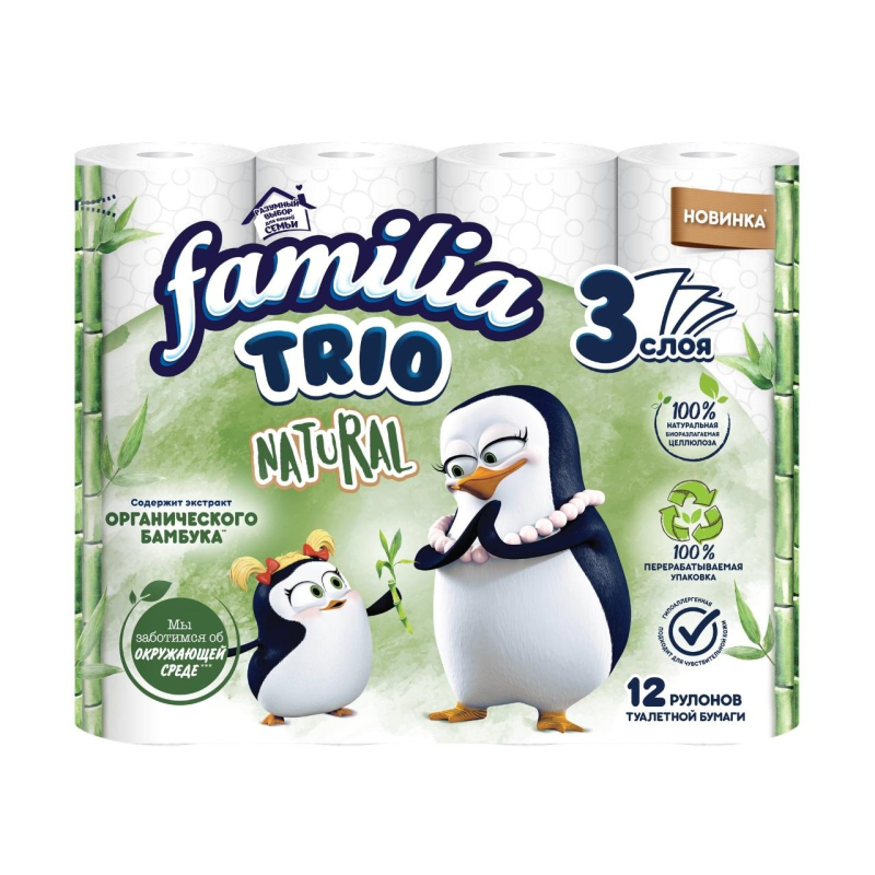 Бумага туалетная Familia Trio 3-слойная белая 16.7 метров (12 рулонов в упаковке) Белая трехслойная бумага Familia Trio необыкновенно мягкая и в то же время прочная. Изготовлена из 100% натуральной целлюлозы. Комфорт и экономия в одной пачке. С тиснением и перфорацией. В рулоне 140 листов размером 9,5x11,9 см. Размеры: длина рулона 16,7 м., ширина рулона 9,5 см., диаметр втулки 4,6 см.