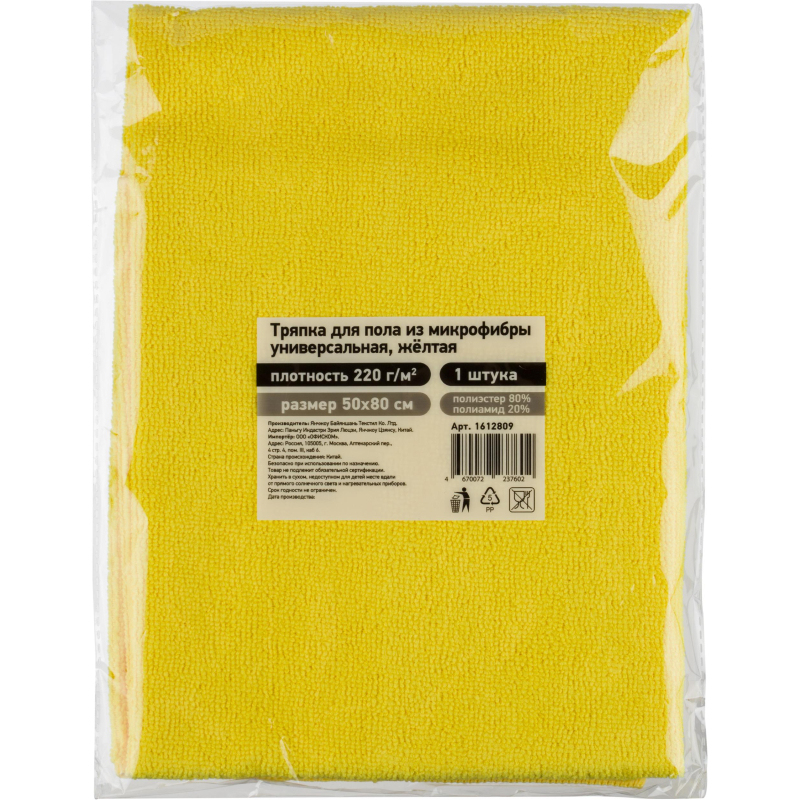 Тряпка для пола микрофибра 50х80 см желтая Назначение: для мытья полов. Тряпка из плотной микрофибры идеально подходит для мытья всех видов покрытий. Она не царапает поверхности и отлично впитывает воду, как губка. Особенности и преимущества: - предназначена для мытья пола из любых материалов; - хорошо впитывает влагу; - полирует поверхность; - удаляет загрязнения и пыль; - легкая и удобная в применении; - долгий срок службы. Характеристики: - размер: 50x80 см. - цвет: желтый - плотность: 220 г/кв.м - состав: 80% полиэстер, 20% полиамид Рекомендации по уходу: нет.