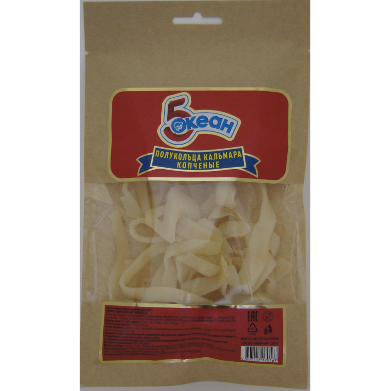 Кольца кальмара 5 Океан копченые 70 г. Состав: филе кальмара, стружка, соль, усилитель вкуса глутанат натрия Е621, антиокислитель лимонная кислота Е330, регулятор кислотности Е331, консерванты Е211, сорбат калия Е202. Энергетическая ценность (средние значения): 170 ккал, 700 кДж. Хранить в сухом, прохладном, проветриваемом помещении от 0°С до 25°С и относительной влажности не более 75%.