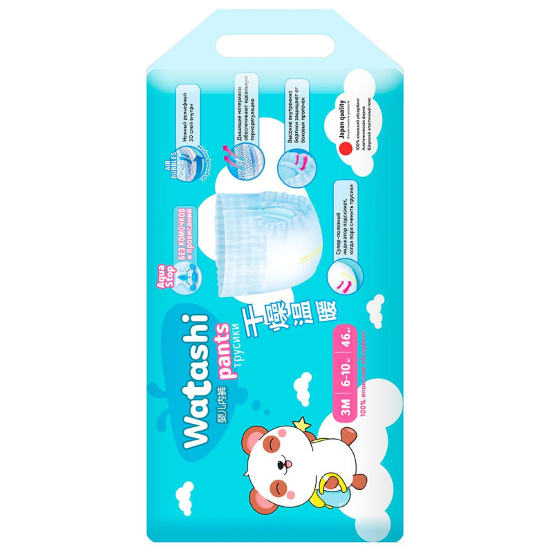 Подгузники-трусики Watashi нового поколения разработаны по японской технологии.В производстве использован лучший японский суперабсорбент на рынке Sumitomo. Именно он отвечает за впитываемость подгузников и обеспечивает сухие дни и ночи для малыша.Aqua stop - запатентованная технология впитывающих каналов. Каналы быстро распределяют воду, не образуя комочков и провисаний.Внутри текстурированный 3D слой для ваших самых нежных зайцев!Дышащий слой защищает кожу от испарений и обеспечивает идеальную терморегуляцию.Высокие внутренние барьерчики не позволят содержимому вытечь наружу.Анатомическая форма - хорошо сидят, не сползают, не сковывают движений, не вызывают дискомфорта.Широкий эластичный поясок мягко облегает, не оставляя следов на коже.Индикатор наполнения - незаменимый помощник родителям, он сообщит вам, когда пора сменить подгузник.Многоразовые липучки анатомической формы крепко фиксируют подгузник на теле.Подходят для использования как днем, так и ночью.