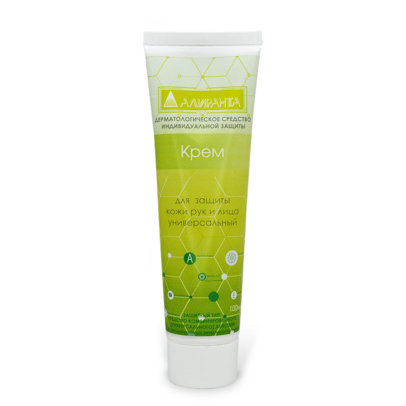 Крем Алиранта защитный универсальный 100 мл. Назначение: крем защищает кожу рук и лица, а также другие участки тела от воздействия водорастворимых и водонерастворимых материалов и веществ. Область применения: рекомендуется использовать при работе с нефтепродуктами, техническими маслами, сажей, графитом, лаками, красками, смолами, органическими растворителями, угольной и металлической пылью, гудроном, битумом, клеем, силиконами, стекловолокнами, растворами кислот, солей, щелочей, смазочно-охлаждающими жидкостями, моющими и дезинфицирующими средствами, водой, известью, цементом, удобрениями, при работе, выполняемой в резиновых перчатках. Свойства: крем обладает универсальной защитой благодаря содержанию как гидрофобных, так и гидрофильных компонентов. Быстро впитывается, не оставляет ощущения липкости. Обладает увлажняющим и ухаживающим эффектом за счет входящих в состав крема глицерина, экстракта календулы, экстракта алоэ, а также защищает от внешнего неблагоприятного воздействия. Витамины А и Е являются уникальными природными соединениями, которые оказывают антиоксидантное, омолаживающее и противовоспалительное воздействие на кожу. Подходит для использования людям с чувствительной кожей. Не вызывает аллергические реакции. Рекомендации по применению: а) небольшое количество крема нанести на чистые и сухие руки и лицо, а также на другие открытые участки тела, равномерно распределить на коже; б) после высыхания крема и образования пленки можно начинать работать; в) по окончании работ вымыть кожу с мылом; г) после работ рекомендуется использовать крем для кожи рук и лица восстанавливающий (регенерирующий). Расход средства на одно применение 0,5-1мл. Меры предосторожности: При попадании на слизистую оболочку глаз - обильно промыть водой. Упаковка: пластиковые тубы 100 мл. Условия хранения: хранить в темном прохладном месте при температуре от 0 до +30°С. Гарантийный срок хранения: 36 месяцев со дня изготовления, 6 месяцев после вскрытия упаковки.