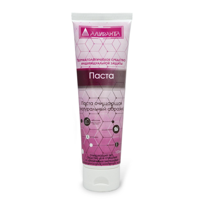 Паста очищающая Алиранта для рук и лица с натуральным абразивом 100 мл. Назначение: паста очищающая предназначена для очистки кожи от сильных промышленных и бытовых загрязнений (масел, смазок, сажи, красок, лаков, смол, клеев, битума, мазута, силиконов, пыли, графита, нефтепродуктов, жира, цемента, извести и т.д.). Входящая в состав пасты абрикосовая косточка, способствует эффективной и бережной очистке кожи. Область применения: паста очищающая применяется в промышленности, связанных с применением смазок, жира, масел, графита, смол, металлической пыли, после работ с землей, а также в быту. Свойства: натуральные абразивы - абрикосовая косточка и древесная мука, содержащиеся в пасте, эффективно и мягко очищают кожу от въевшейся грязи. Ксантановая камедь облегчает удаление трудносмываемых загрязнений. Содержание в составе пасты кокосового масла питает кожу, смягчает, увлажняет и восстанавливает, препятствует возникновению трещинок, шелушений и раздражений. Аллантоин способствует заживления поврежденных тканей кожи. Витамины А и Е являются уникальными природными соединениями, которые оказывают антиоксидантное, омолаживающее и противовоспалительное воздействие на кожу Рекомендации по применению: а) перед применением пасты руки не следует смачивать водой; б) средство нанести на загрязненные руки и тщательно растереть; в) полностью смывать остатки пасты с грязью большим количеством воды и тщательно высушить руки. г) после очистки кожи рекомендуется использовать крем для кожи рук и лица восстанавливающий (регенерирующий). Расход средства на одно применение 0,5-1мл. Меры предосторожности: при попадании на слизистую оболочку глаз - обильно промыть водой. Условия хранения: хранить в темном прохладном месте при температуре от 0 до +30°С. Гарантийный срок хранения: 36 месяцев со дня изготовления, 12 месяцев после вскрытия упаковки.
