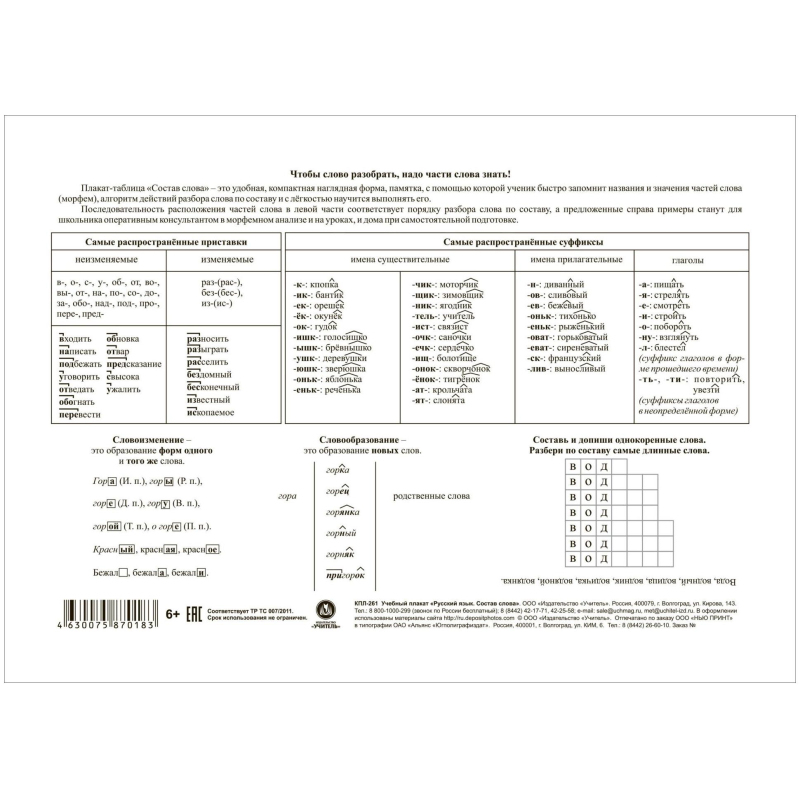 Учебный плакат "Состав слова" - это удобная, компактная наглядная форма, памятка, с помощью которой каждый ученик быстро запомнит названия и значения частей слова (морфем), алгоритм действий разбор слова по составу и с легкостью научится выполнять его. Последовательность расположения частей слова в левой колонке соответствует порядку разбора слова по составу, а предложенные в последней колонке таблицы примеры доступно в содержательном отношении и наглядно в зрительном восприятии помогут школьнику освоить разбор слова по составу (морфемный разбор). Материал мелованная бумага, плотностью 250 г/кв.м. Размер изделия - 210х148 мм. Адресовано ученикам начальных классов для отработки устного и письменного разбора слов по составу, а также учителям и родителям для занятий с детьми.