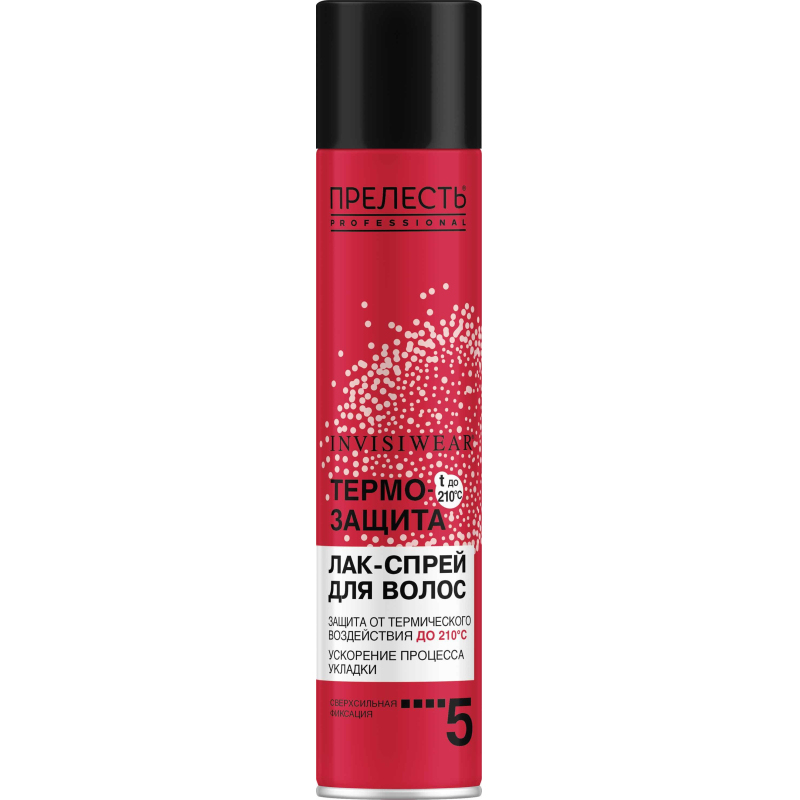 При частом использовании термических приборов для стайлинга или сушки волос, локоны тускнеют, теряют свой цвет, естественную упругость и становятся сухими и ломкими. С помощью лака для волос Прелесть Professional Invisiwear 'Термозащита' можно оградить их от влияния высоких температур (до 210°C) и уложить, зафиксировав форму до 24 часов. В составе лака-спрея пантенол, который питает и увлажняет волосы, восстанавливая их структуру. Силиконы, полностью обволакивают каждый волосок, защищая от воздействия высокой температуры по всей длине. Спрей можно наносить как на сухие, так и на влажные пряди для последующей завивки или выпрямления. В результате применения линейки средств Прелесть Professional Invisiwear 'Термозащита' лак и мусс, волосы в 5,7 раз меньше ломаются и портятся от укладки с термическими приборами, выглядят здоровыми и гладкими. Состав: DME, AlcoholDenat 32,22% vol, Aqua, Octyl acrylamide/Acrylates/Butylaminoethyl Methacrylate Copolymer, Aminomethyl Propanol, PEG-12Dimethicone, Panthenol, Parfum.