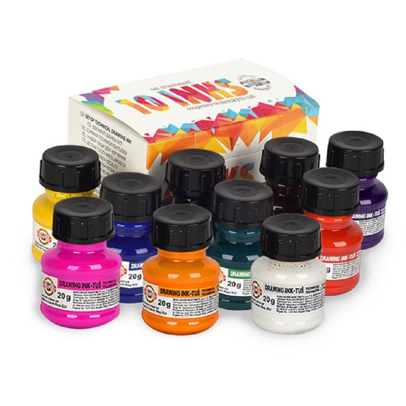 Тушь предназначена для оформительских работ, используется на бумаге и кальке. Яркий, насыщенный цвет. Наносится с помощью специальных перьев, кистей, а также деревянными палочками и поролоном. Также под крышечкой есть встроенная палочка со скошенным кончиком. Все инструменты после работы следует отмывать водой, т.к. после высыхания тушь не смывается. Не допускать замерзания. Перед применением хорошо встряхивать. Набор из десяти баночек упакован в картонную коробку, размер 165x66x51 мм.