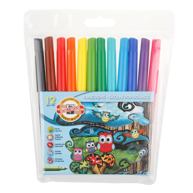 Фломастеры Koh-i-Noor Совы 12 цветов для рисования на бумаге и картоне - это яркие фломастеры на водной основе, поэтому они хорошо смываются с рук и отстирываются с одежды. Круглый корпус с треугольной зоной захвата удобен для детской руки, вентилируемый колпачок обеспечивает безопасность при случайном проглатывании. Толщина линии при письме 1-2 мм, максимальная длина письма 600 метров. Фломастеры имеют увеличенный срок годности - 5 лет. Рекомендованы детям старше трех лет. Упакованы в пакет их ПВХ с подвесом, размер 193x146x11 мм.
