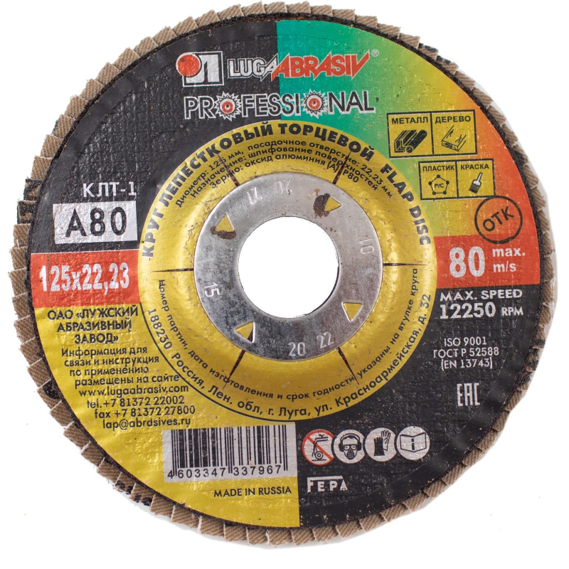 Круг лепестковый торцевой используется совместно с угловыми шлифмашинами для торцевого и плоского шлифования изделий из металла, дерева, пластмассы, зачистки сварных швов и заусенцев, снятия ржавчины и т. д. Круг изготовлен на гибкой основе, имеет высокую производительность и износостойкость. Посадочный диаметр: 22.23 мм. Диаметр наружний: 125 мм. Рабочая скорость кругов м/сек: 80. Шлиф.материал: А80.