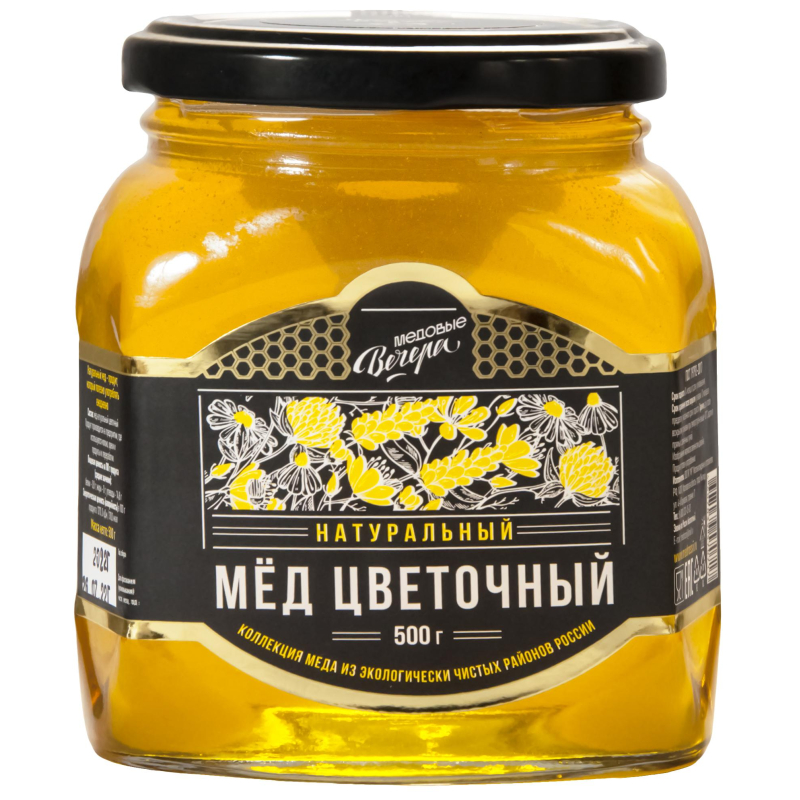 Мед Медовые Вечера Цветочный натуральный 500 г. Состав: мед натуральный цветочный. Пищевая ценность в 100 г: белки - 0,8 г, углеводы -74,6 г. Хранить при температуре не выше +20°С, вдали от прямых солнечных лучей. ГОСТ 19792-2017.