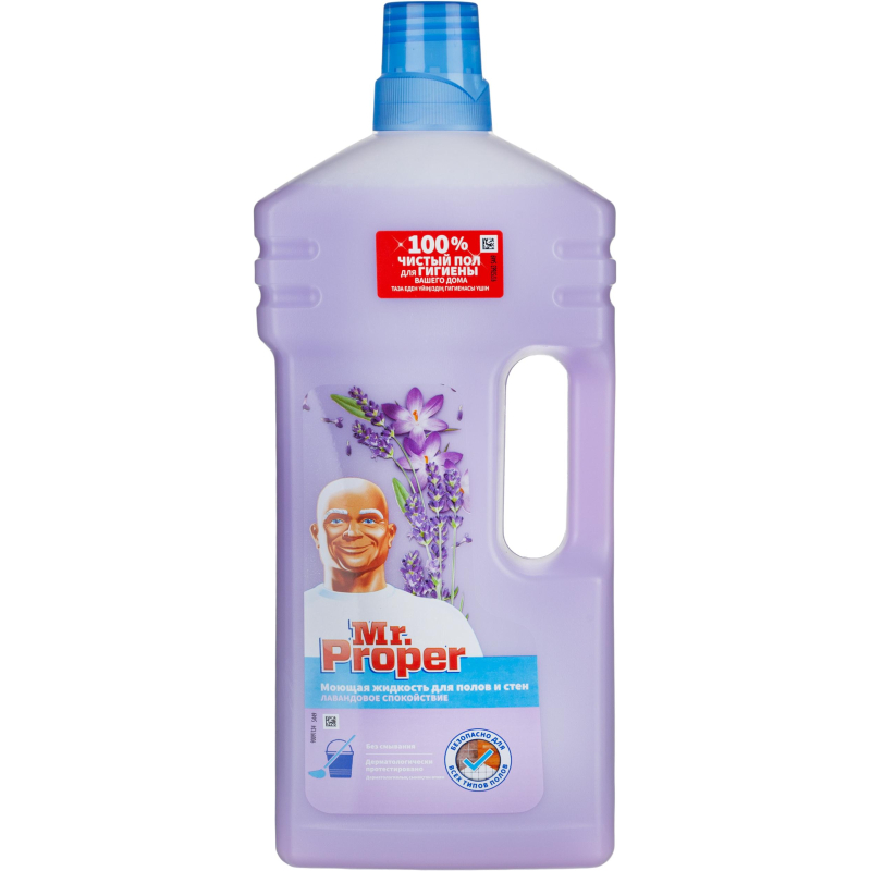 Универсальное чистящее средство Mr. Proper Лавандовое спокойствие жидкость 1.5 л. Назначение Жидкость предназначена для мытья полов, стен и других твердых поверхностей с любым покрытием. Входящие в состав активные вещества деликатно очищают даже сложные и въевшиеся пятна, придавая поверхности сверкающую чистоту и свежесть. Способ применения Подробные инструкции по применению указаны на упаковке. После очищения поверхностей, соприкасающихся с пищевыми продуктами, необходимо промыть их водой. Меры предосторожности Хранить вдали от детей. Не допускать попадания в глаза. В случае попадания в глаза тщательно промойте водой. Состав Менее 5% неионогенные ПАВ; консерванты, ароматизирующие компоненты, амилциннамал, бутилфенил метилпропионал, гераниол, гексилкоричный альдегид, лимонен, линаноол. Условия хранения Хранить в плотно закрытой упаковке, отдельно от пищевых продуктов, в недоступном для детей месте. Срок годности 18 месяцев с даты изготовления (см. на упаковке).