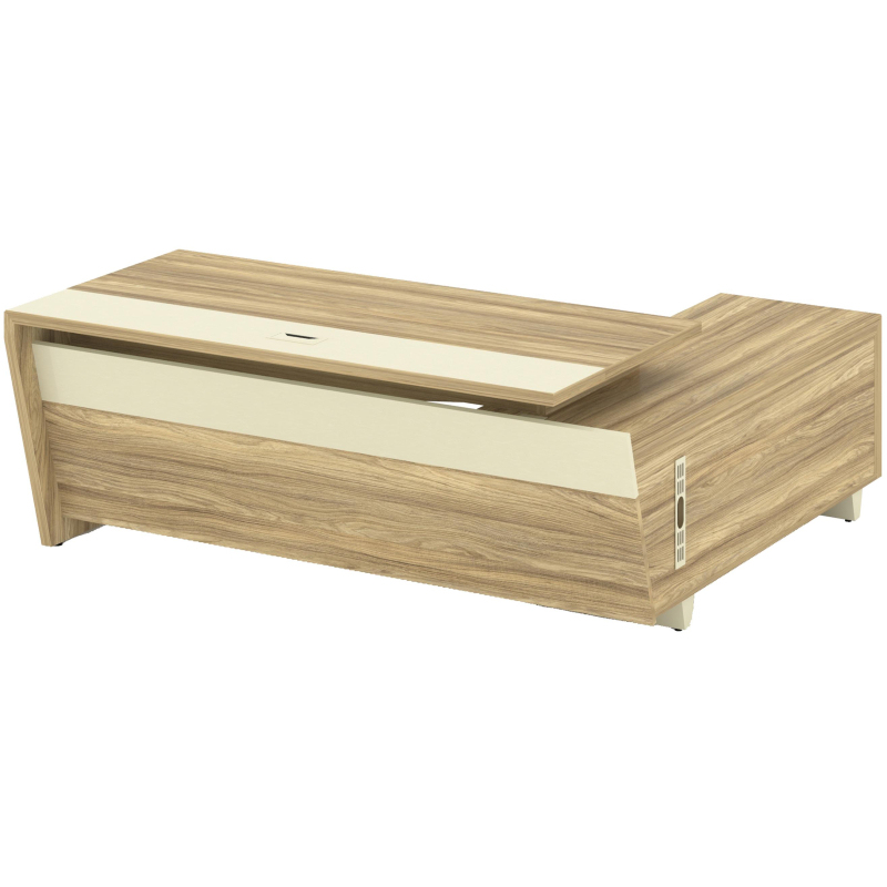 Внимание! Пожалуйста, проверяйте цвет изделия до начала сборки! Цвет на изображении товара в интернет-магазине или в печатном каталоге может отличаться от оригинала из-за особенностей цветопередачи. Стол состоит из столешницы, опоры (левая), перемычки стола, царги, заглушки кабель-канала и опорной тумбы. Столешница прямоугольной формы, состоит из двух деталей изготовленных из ЛДСП и глянцевого МДФ толщиной 36 мм, торцы облицованы по периметру кромкой ПВХ толщиной 2 мм в цвет ЛДСП. Все детали столешниц собираются при помощи специальных стяжек для столешниц. В столешнице присутствует технологическое отверстие для установки заглушки кабель-канала размером 160х80 мм. Опоры и перемычка эргономической формы изготавливаются из ЛДСП толщиной 36 мм. Опора соединяется со столешницей при помощи металлических уголков и винтов. Остальные детали крепиться при помощи шкантов и эксцентриковых стяжек. Стык соединения опоры и столешницы с запилом под 45 градусов. Царга стола из состоит из трех деталей. Верх царги изготовлен из глянцевого МДФ, низ царги изготовлен из ЛДСП, усиливающая планка изготовлена из ЛДСП. Все детали царги имеют толщину 18 мм, торцы облицованы по периметру кромкой ПВХ толщиной 2 мм. В основание опор вбиваются втулки с резьбой М6, диапазон регулировки - до 20 мм. Опорная тумба состоит из обклада, который изготавливается из ЛДСП 36мм и корпуса тумбы с выдвижными ящиками и фасадами изготавливаемой из ЛДСП 18мм. Стык соединения обклада боковой панели и столешницы с запилом под 45 градусов. Сборка опорной тумбы осуществляется при помощи шкантов, конформатов и эксцентриковых стяжек. Тумба устанавливается на конусообразные металлические опоры и скрепляется при помощи винтов и забивных футорок. В основании металлических опор вкручиваются регулируемые опоры с резьбой М8, диапазон регулировки - до 20 мм. Так же в тумбе предусмотрены 3 выдвижных ящика (устанавливаемые на шариковые направляющие полного выдвижения с доводчиком, длинной 400 мм) с центральным замком. Распашной фасад имеет петли с доводчиком. Полка устанавливается на полкодержатели. На всех фасадах устанавливаются ручки (межосевое расстояние 160 мм). В дне и задней стенке тумбы предусмотрены специальные отверстия для установки заглушек кабель-каналов. Изделие поставляется в разобранном виде. Комплект фурнитуры и подробная инструкция по сборке изделия вкладываются в упаковку.