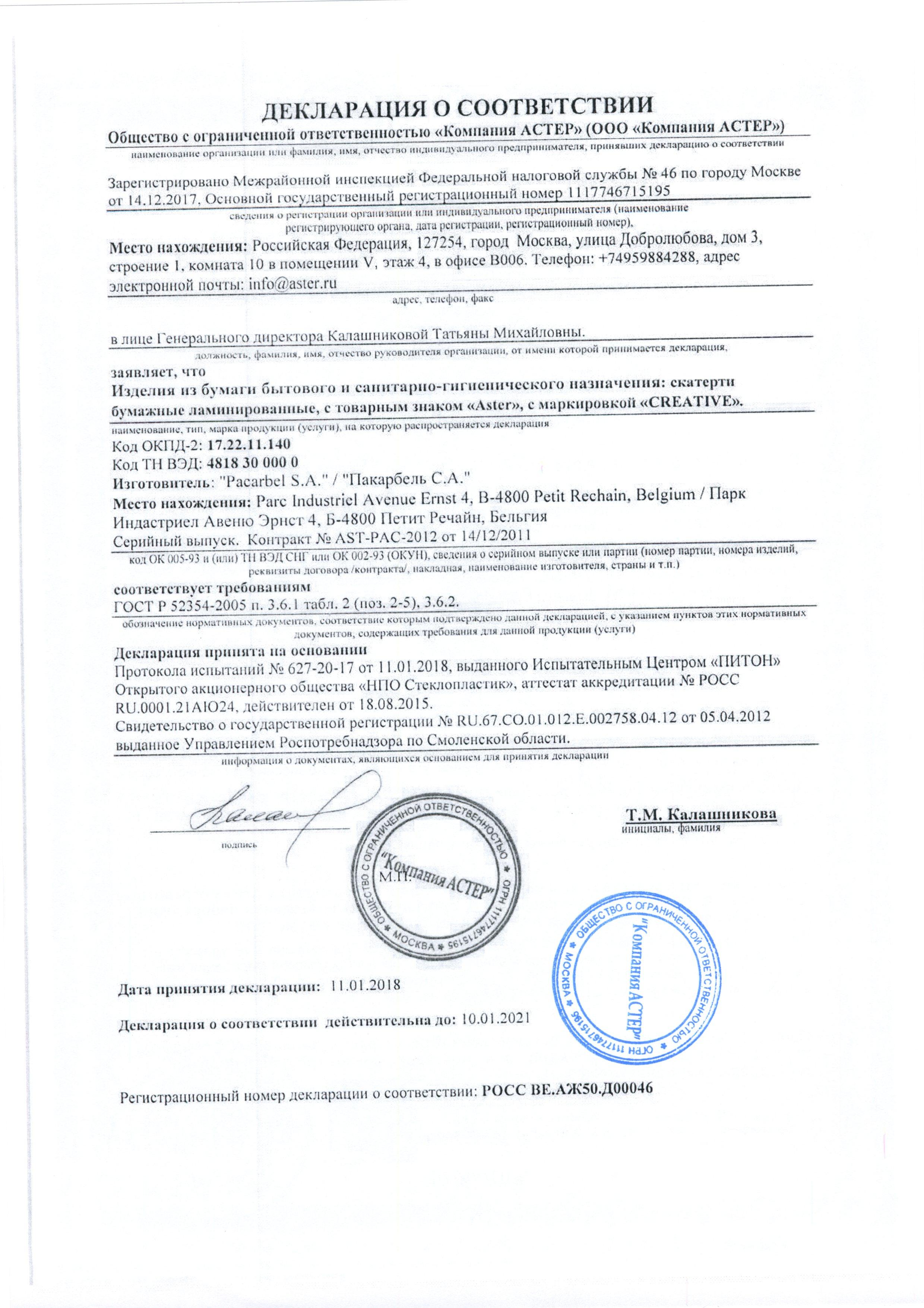 Одноразовую однослойную бумажную скатерть Aster Creative производят по самым современным технологиям. Ламинированная бумага с эффектом шелка — на ощупь очень нежный материал, который не пропускает влагу. Это достигается специальной обработкой. На бумагу наносится рисунок и сверху покрывается влагонепроницаемой плёнкой с шелковым эффектом. Скатерть поможет создать приятную атмосферу за обеденным столом, как в небольшом кафе, так и в столовой крупной компании. Пятноустойчивая поверхность.