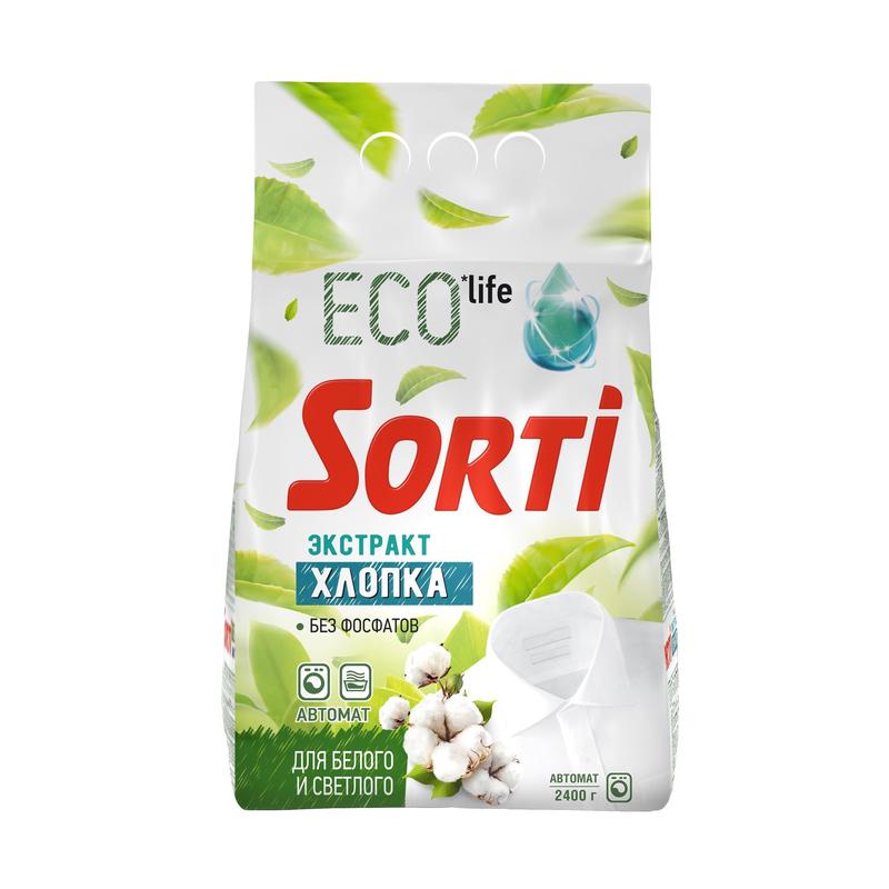 Порошок стиральный Sorti Экстракт хлопка Автомат 2400 г. Стиральный порошок Sorti не допустит появления пятен на Вашей репутации лучшей мамы и хозяйки в доме. Эффективно отстирывает, препятствует образованию серости и желтизны на тканях. Выбор миллионов российских потребителей с 1998 года, лучшее сочетание цены и качества в своем сегменте. Новая формула с природными компонентами бережно и нежно заботится о ваших вещах, придавая мягкость и белизну хлопка. Способ применения:замачивайте и стирайте белье в теплой воде после полного растворения порошка (подробная информация о дозировке указана на упаковке). Замачивать не дольше 2 часов. Прополощите белье теплой, а затем холодной водой до исчезновения пены. Рекомендованная температура стирки указана на ярлыках текстильных изделий. Меры предосторожности:беречь от детей! Избегать попадания в глаза. При попадании в глаза - немедленно промыть проточной водой. Не глотать. При проглатывании обратитесь за медицинской помощью. Хранить вдали от пищевых продуктов. При повышенной чувствительности и повреждениях кожи избегать длительного контакта с любыми средствами для стирки. Состав:5-15% анионные ПАВ;