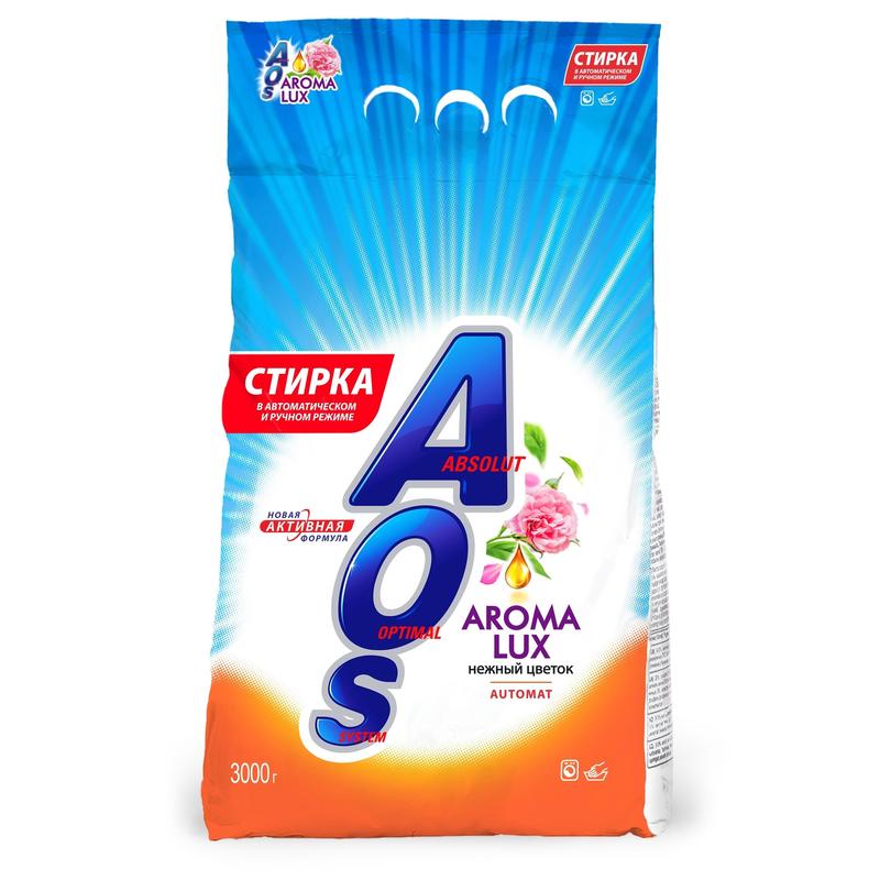 Порошок стиральный автомат AOS Aroma Lux 3000 г. Эффектное решение для качественного ухода за одеждой с интенсивной ароматизацией ткани. Бережно отстирывает, полностью выполаскивается. Нежный аромат закрепляет безупречный результат стирки, свежести и чистоты. Способ применения:замачивайте и стирайте белье в теплой воде после полного растворения порошка (подробная информация о дозировке указана на упаковке). Замачивать не дольше 2 часов. Прополощите белье теплой, а затем холодной водой до исчезновения пены. Рекомендованная температура стирки указана на ярлыках текстильных изделий. Меры предосторожности:беречь от детей! Избегать попадания в глаза. При попадании в глаза - немедленно промыть проточной водой. Не глотать. При проглатывании обратитесь за медицинской помощью. Хранить вдали от пищевых продуктов. При повышенной чувствительности и повреждениях кожи избегать длительного контакта с любыми средствами для стирки. Состав:5% или более, но менее 15%: анионные ПАВ; менее 5%: неионогенные ПАВ, мыло (соли жирных кислот), отбеливающие вещества на основе кислорода, энзимы, оптический отбеливатель, поликарбоксилаты, фосфонаты, ароматизирующая добавка (в т.ч. гексилциннамаль). Срок годности:24 месяца.