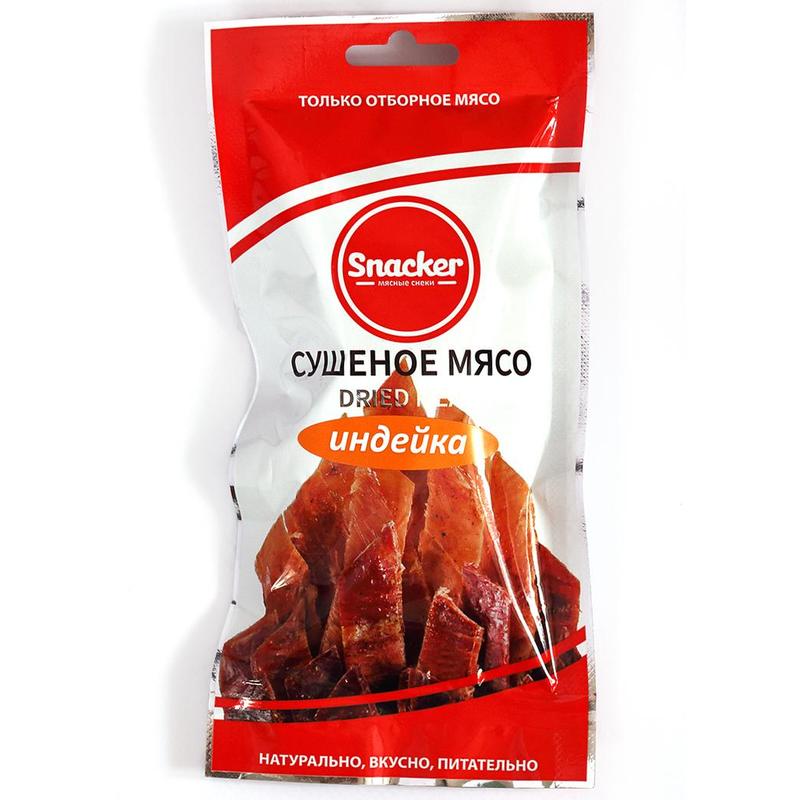 Индейка сушеная Snacker 50 г. Состав: мясо индейки, мясо курицы, посолочная смесь (соль поваренная, фиксатор окраски-нитрит натрия), сахар, специи (паприка, перец черный, чеснок). Пищевая ценность: белки - 52,3 г, жиры - 10,0 г. Энергетическая ценность на 100 г: 303 ккал, 1268 кДж. Хранить при температуре от 0°С до +25°С, и относительной влажности не более 78%. При хранении допускается естественная кристаллизация соли на поверхности продукта. После вскрытия пакета продукт хранить при температуре 0+6°С не более 7 суток.