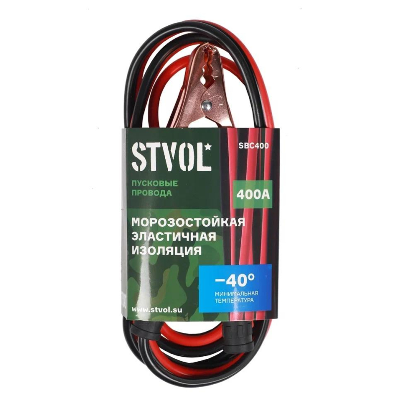 Провода прикуривания Stvol используются для запуска двигателя автомобиля с севшей АКБ. Изготовлены из сплава алюминия и меди и покрыты морозостойким термопластиком, который сохраняет свою эластичность даже в -40 °С. Провода прикуривания Stvol имеют длину 2,5 метра и пропускают ток силой до 400 ампер. Важно! При работе с проводами прикуривания Stvol SBC400 обязательно соблюдайте меры предосторожности и основные правила запуска автомобиля с севшей акб от автомобиля "донора".