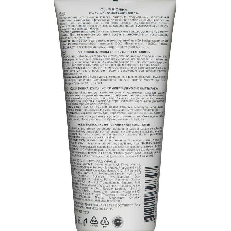 Кондиционер для волос Ollin Bionika Питание и блеск 200 мл. Верните своим волосам былое качество и блеск! Бальзам-кондиционер Ollin Bionika содержит сразу нескольких аминокислотных комплексов и кератин, которые позволяют восстановить волосы по все длине. Кондиционер 'Питание и блеск' содержит специальный кератиновый комплекс, эффективно решающий проблему сечения волос не только на кончиках, но и по всей длине. Аминокислоты питают и восстанавливают структуру волоса, обеспечивают глубокий уход и защиту, придают сверкающий блеск. Свойства и особенности Сохраняет насыщенный цвет. Бриллиантовый блеск. Упругие и эластичные волосы. Меньше повреждений. Активные компоненты Эластин - способствует быстрому восстановлению волос, защищает от агрессивных компонентов. Налидон - естественный увлажнитель, защищает волосы от потери влаги. Аминокислотный комплекс Prodew 500 - повышает эластичность и упругость. Оказывает выраженный антиоксидантный эффект, делая волос ярким и насыщенным. Гидролизованный кератин - формирует защитный слой на коже головы и волосах, проникает внутрь кортекса, усиливает волос, делая кутикулу гладкой. Способ применения: Нанести на чисто вымытые волосы. Выдержать 2-3 минуты. Тщательно смыть. Объем: 200 мл.