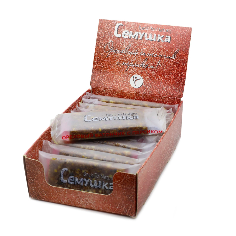 Батончик фруктово-ореховый Семушка с персиком (12 штук по 40 г). Состав: персик сушеный (Армения), изюм, груша сушеная, ядра фундука сушеные, финик сушеный. Пищевая ценность на 100 г: белки - 4,9 г, жиры - 13,6 г, углеводы - 52,56 г. Энергетическая ценность на 100 г: 352,3 ккал. Хранить при температуре от +5 до +21°С. Срок годности: 6 месяцев. Страна производства: Россия.