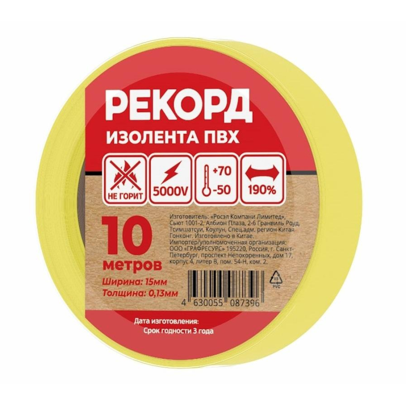 Изолента Рекорд ПВХ 15 мм x 10 м желтаяРазработана и изготовлена на основе пленки из поливинилхлоридного изоляционного пластиката, используемой в производстве профессиональных изоляционных лент. Специальные добавки, входящие в состав данного материала, повышают эластичные свойства ленты, увеличивают ее долговечность и обеспечивают устойчивость к горению. Допускается применение при температуре от -50 до +70 °С. Удлинение до разрыва: не менее 190%. Рабочее напряжение: 5000 В Ширина: 15 мм. Длина: 10 м. Толщина: 130 мкм Цвет: желтый