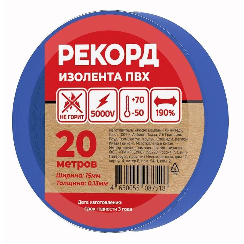 Изолента Рекорд ПВХ 15 мм x 20 м синяяРазработана и изготовлена на основе пленки из поливинилхлоридного изоляционного пластиката, используемой в производстве профессиональных изоляционных лент. Специальные добавки, входящие в состав данного материала, повышают эластичные свойства ленты, увеличивают ее долговечность и обеспечивают устойчивость к горению. Допускается применение при температуре от -50 до +70 °С. Удлинение до разрыва: не менее 190%. Рабочее напряжение: 5000 В Ширина: 15 мм. Длина: 20 м. Толщина: 130 мкм Цвет: синий