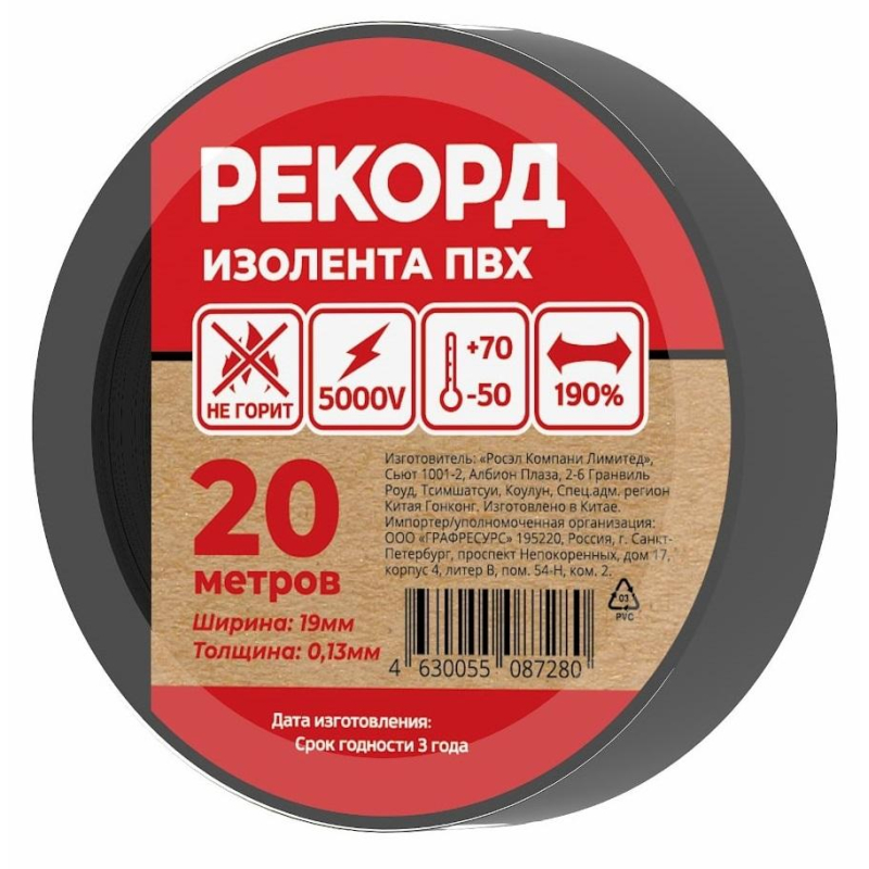 Изолента Рекорд ПВХ 15 мм x 20 м чернаяРазработана и изготовлена на основе пленки из поливинилхлоридного изоляционного пластиката, используемой в производстве профессиональных изоляционных лент. Специальные добавки, входящие в состав данного материала, повышают эластичные свойства ленты, увеличивают ее долговечность и обеспечивают устойчивость к горению. Допускается применение при температуре от -50 до +70 °С. Удлинение до разрыва: не менее 190%. Рабочее напряжение: 5000 В Ширина: 15 мм. Длина: 20 м. Толщина: 130 мкм Цвет: черный