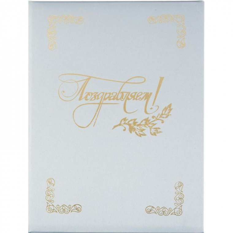 Адресная папка формата А4. Папка выполнена из переплетного материала танго серебристого цвета (слой ПВХ на бумажной основе). На обложку с помощью тиснения золотой фольгой нанесены угловые орнаменты и надпись Поздравляем!. Внутренние вклейки — из льна, есть фиксирующий ремешок. Ручная сборка. На папку можно нанести корпоративный логотип. Папка может использоваться для вручения наград и дипломов, передачи бумаг на подпись