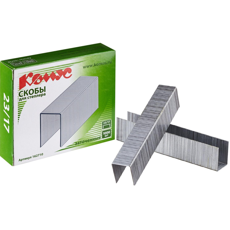 Скобы для степлера № 23/17 Комус предназначены для степлеров со сшивающей способностью от 130 до 160 листов (для бумаги толщиной 0,07 и 0,08 мм). Скобы № 23/17 выполнены из металла с цинковым покрытием. 1000 скоб в картонной пачке. В промежуточной упаковке - 10 пачек по 1000 скоб.