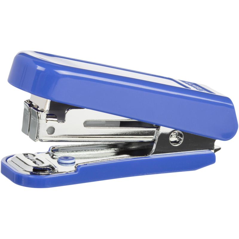 Мини-степлер Комус предназначен для надежного и качественного скрепления документов в офисе и дома. Настольный степлер выполнен в пластиковом корпусе синего цвета. Степлер Комус одновременно сшивает до 16 листов бумаги плотностью до 80 г/кв.м. Степлер скрепляет бумагу закрытым типом сшивания, при котором ножки скобы загибаются внутрь. Это дает возможность надежно хранить сшитые документы на протяжении длительного времени. Степлер совместим со скобами № 10. Глубина закладки бумаги - 26 мм (2,6 см). Модель оснащена встроенным антистеплером. Вместимость лотка для скоб: 50 скоб размером № 10. Размер изделия: 65x34x22 мм. Компактный размер удобен в использовании и занимает мало места на рабочем столе.