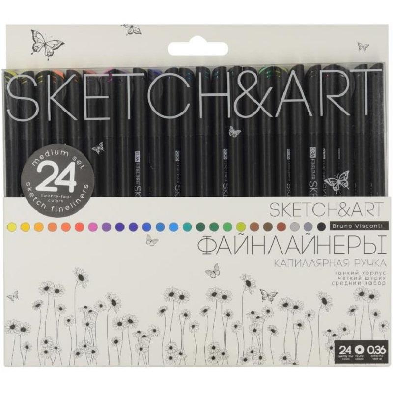 Набор линеров для скетчинга Sketch&Art black edition 24 цветов (толщина линии 0.36 мм). Набор линеров 'Sketch&Art' для рисования, набросков, письма, каллиграфии, леттеринга, чертежных работ. Изюминку лаконичному дизайну корпуса линера придает колпачок, завершающийся элементом в виде капельки в цвет чернил линера. Лаконично, но в тоже время изящно - приятно и комфортно держать линер в руке. Еще приятнее работать с ним: мягкое скольжение по поверхности бумаги обеспечивает наконечник из высококачественного синтетического волокна, устойчивого к истиранию. Он достаточно прочный, но гарантирует ультратонкую линию. Толщина линии - 0,36 мм. Металлический обжим наконечника дает возможность работать с линейками и трафаретами. Пигментные чернила на водной основе не имеют запаха, легко смываются с рук и отстирываются от ткани. Мягкая, прозрачная упаковка с европодвесом обеспечивает удобное хранение и транспортировку линеров. Богатая цветовая палитра - 24 цвета, высокое качество производства, брендированная картонная упаковка с покрытием Soft Touch - отличная идея для подарка!
