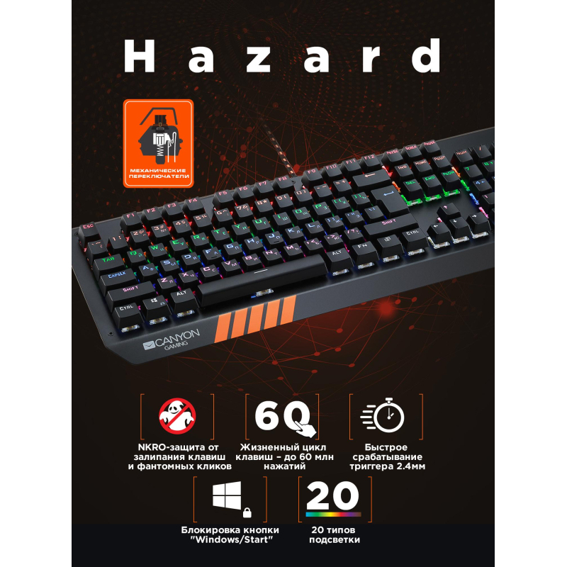 Canyon CND-SKB6-RU механическая клавиатура с blue switches имеет 104 клавиши. Каждая кнопка способна выдержать более 60 миллионов нажатий. В модели реализовано 20 типов яркой подсветки и специальные комбинации, настроенные для десяти самых популярных игр. 2 из 10 комбинаций можно перепрограммировать под индивидуальные особенности игрока. Продвинутая технология NKRO с защитой от фантомных кликов и залипания клавиш, а также блокировка 'Windows/Start' обеспечат бесперебойный отклик даже при условии большого количества частых нажатий. Характеристики: 104 механические кнопки; Синие механические переключатели; Глубина нажатия 4.0 мм; Глубина срабатывания 2.4 мм с силой 60+/-10g; Кнопки рассчитаны на 60 миллионов нажатий; NKRO-защита от залипания клавиш и фантомных кликов; Блокировка кнопки "Windows/Start"; 20 типов подсветки; 6 настроек подсветки для наиболее популярных игр с возможностью перепрограммирования; Нанесение символов методом "Double Injection". Внешний вид и/или характеристики товара могут быть изменены производителем в соответствии с производственным процессом.