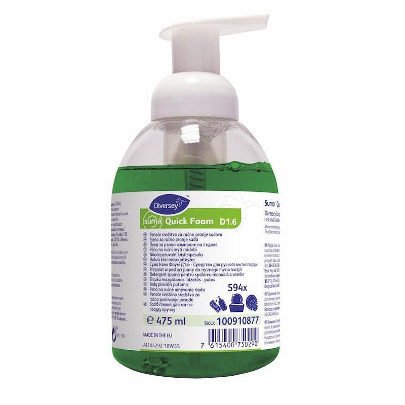 Средство для мытья посуды Diversey Suma Quick Foam D1.6 475 мл (концентрат) Назначение: средство Suma Quick Foam D1.6 является концентрированным нейтральным пенным моющим средством для ручного мытья всех типов столовой посуды. Данный продукт обладает оптимальным сочетанием поверхностно-активных веществ, позволяющих эффективно удалять жир и засохшие остатки пищи. Средство легко смывается и не оставляет разводов на поверхности посуды. Экономично в использовании, благодаря концентрированной формуле и специальной помпе-дозатору. Не требует замачивания. Область применения: для применения на объектах ЖКХ, предприятиях общепита и пищевой промышленности, пищевых производствах, в торговле, ресторанах, столовых, объектах социального обеспечения, в гостиницах, офисах, образовательных учреждениях (включая школьные и дошкольные), ЛПУ, согласно рекомендациям производителя. Способ применения: однократно нажать на помпу-дозатор, чтобы нанести средство на ручной пад или щетку. Вымыть посуду с помощью ручного пада или щетки. Тщательно ополоснуть и оставить самостоятельно высыхать. Для удаления сильных загрязнений увеличить дозировку Состав: вода, алкилбензолсульфокислота, алкил (C12-14) (3EO) серная кислота Na-соль, лимонная кислота, гидроксид натрия, краситель, отдушка. Срок годности: 2 года с момента производства (при соблюдении условий хранения, рекомендованных производителем.