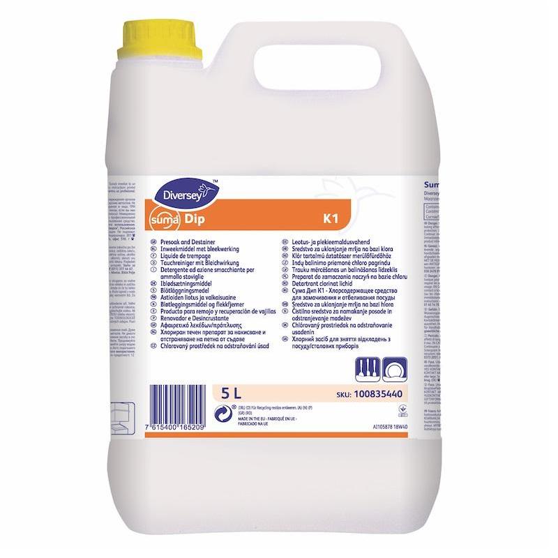 Средство для замачивания и отбеливания посуды Diversey Suma Dip K1 5 л (концентрат) Назначение: средство Suma Dip K1 является хлорсодержащим, щелочным жидким средством для отбеливания сильнозагрязненных поверхностей посуды при замачивании. В основе средства Suma Dip K1 содержится эффективное сочетание противонакипных веществ и ПАВ, препятствующих образованию налета и устраняющих со всех поверхностях посуды трудноудаляемые загрязнения. В состав средства также входит активно действующий хлор для эффективного удаления налета от чая, кофе и фруктов. Удаляет трудноудаляемые пятна с содержанием танина. Эффективно устраняет с поверхности посуды пригоревшие остатки пищи и пятна крахмала. Дозируется как вручную, так и с помощью дозирующего оборудования. Легко растворяется в воде и быстро проявляет свои отбеливающие свойства. Область применения: для применения на объектах ЖКХ, предприятиях общепита и пищевой промышленности, пищевых производствах, в торговле, ресторанах, столовых, объектах социального обеспечения, в гостиницах, офисах, образовательных учреждениях (включая школьные и дошкольные), ЛПУ, согласно рекомендациям производителя. Способ применения: 1. Наполнить раковину для замачивания посуды теплой водой (30°C-40°C). 2. Добавить средство Suma Dip K1 в пропорции 6-16 мл на 1л воды. 3. Погрузить в раствор посуду на 15-30 мин (в зависимости от уровня загрязнения). 4. Тщательно ополоснуть посуду водой. 5. Мыть посуду в посудомоечной машине при обычном режиме. Не оставлять в растворе расписные фарфоровые изделия и посуду из пластика более, чем на 30 минут во избежание возможных повреждений. Не использовать средство для замачивания меламиновой посуды. Состав: вода (мягкая), трифосфат натрия, трисиликат натрия, гидроксид калия, алкил (C12-14) диметиламиноксид, гипохлорит натрия. Срок годности: 2 года с момента производства (при соблюдении условий хранения, рекомендованных производителем).