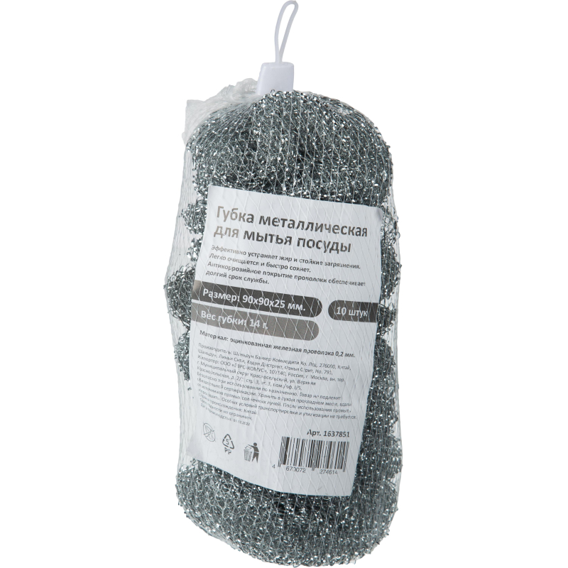 Губки для мытья посуды металлические 90х90x25 мм 14 г 10 штуки в упаковке. Предназначена для чистки кастрюль, чугунных сковород и противней. После использования тщательно промыть и просушить. Оцинкованная железная проволока эффективно удаляет въевшиеся загрязнения. Размер губки (ДхШхВ, мм): 90х90х25. Вес: 14 г. Количество в упаковке: 10 шт. Цвет: металлик.