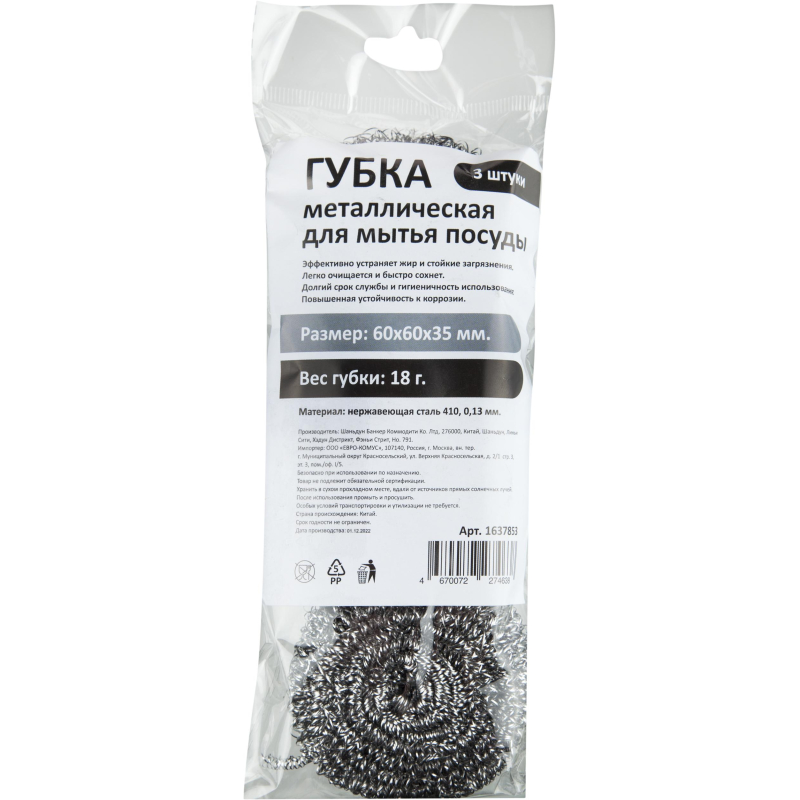 Губки -мочалка металл для мытья посуды 60x60x35мм 18г нерж.сталь 3шт/уп